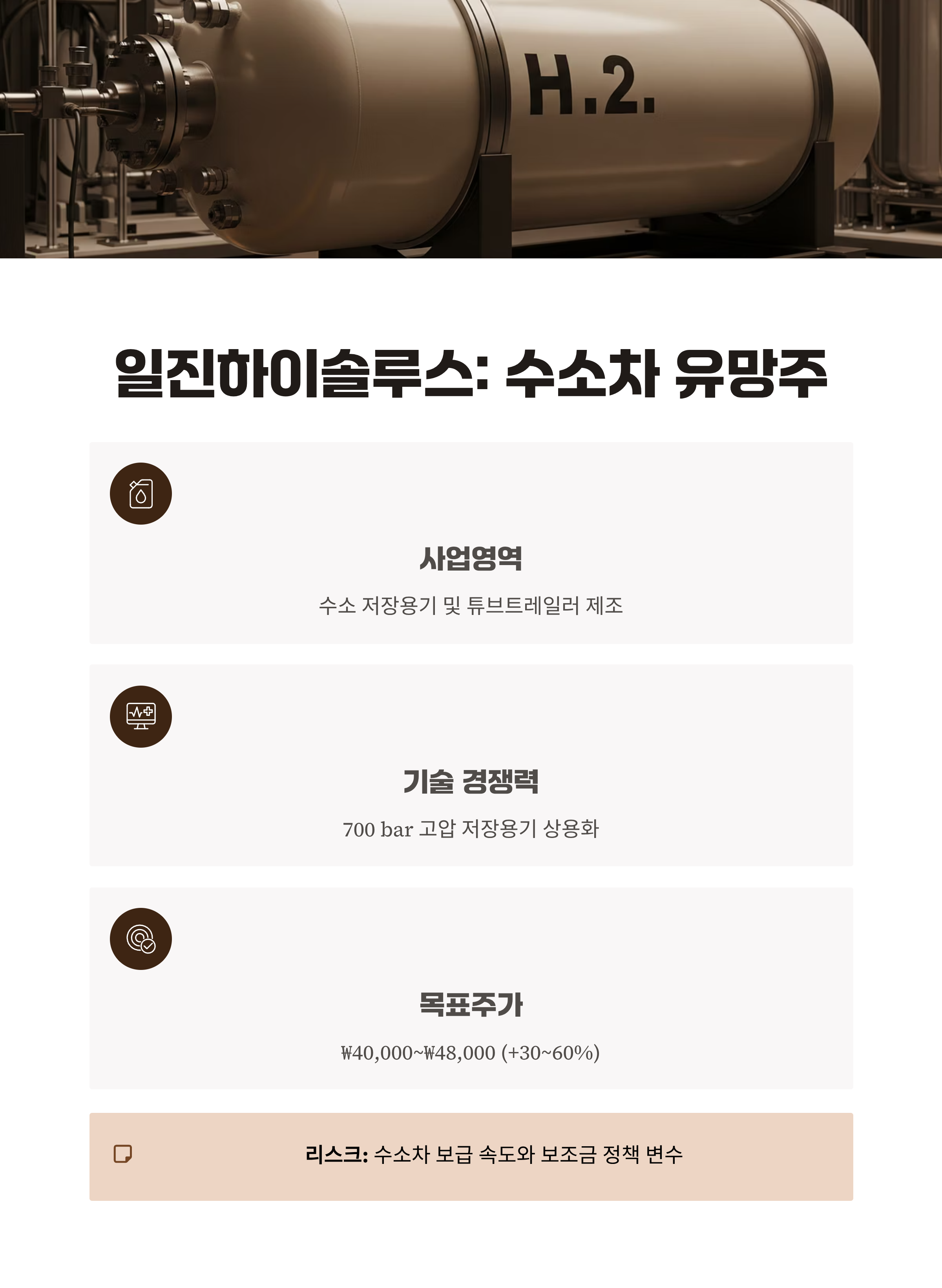 일진하이솔루스는 수소차 밸류체인의 핵심 부품기업으로, 수소차 확산 시 직접적인 수혜가 가능하지만 시장 보급 속도가 변수가 될 수 있습니다.