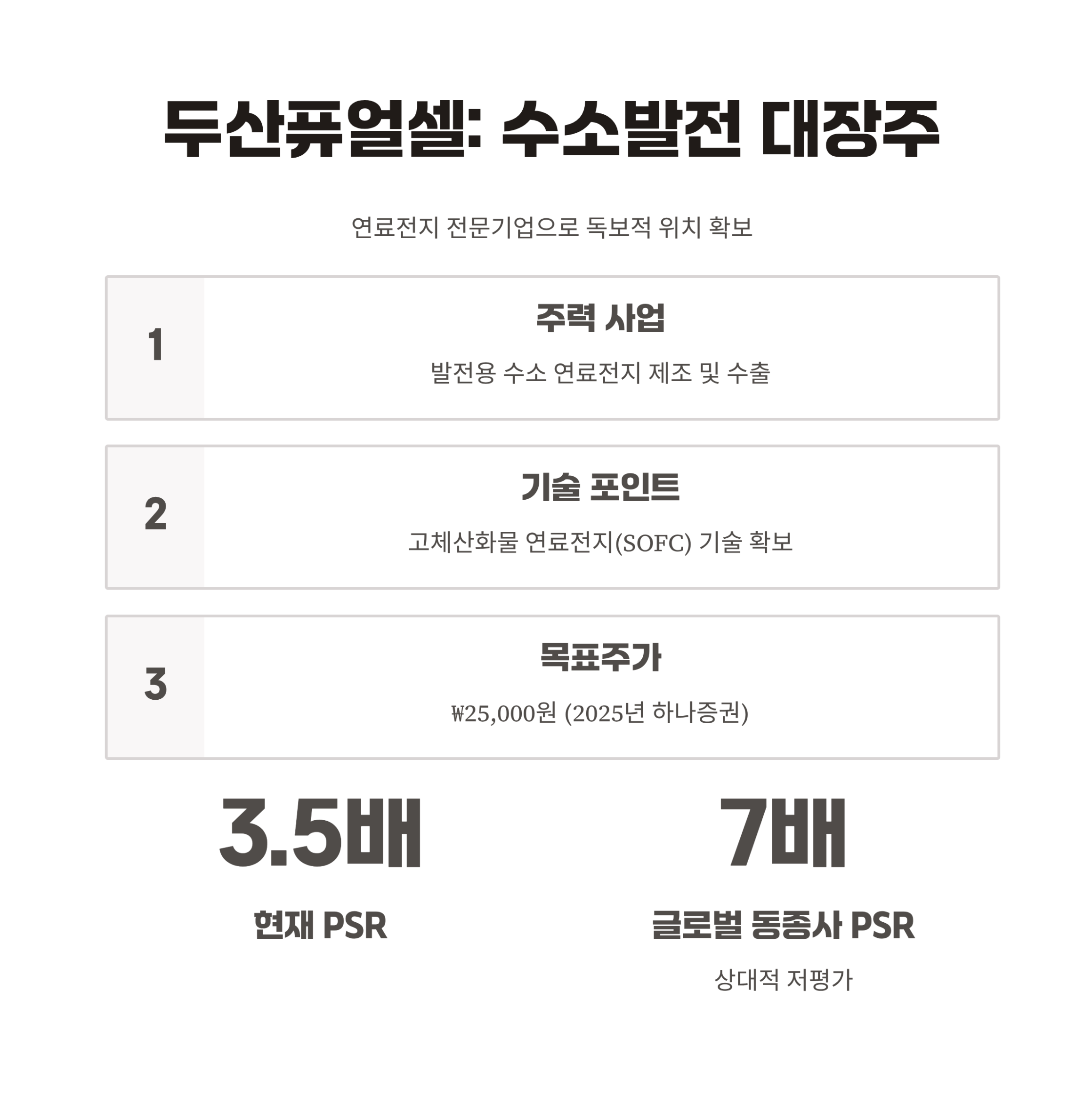 두산퓨얼셀은 정부 정책 수혜 + 기술력 + 글로벌 진출 준비라는 세 가지 키워드가 동시에 부각되며, 향후 중장기 성장 동력으로서 충분한 매력을 지닌 종목입니다.