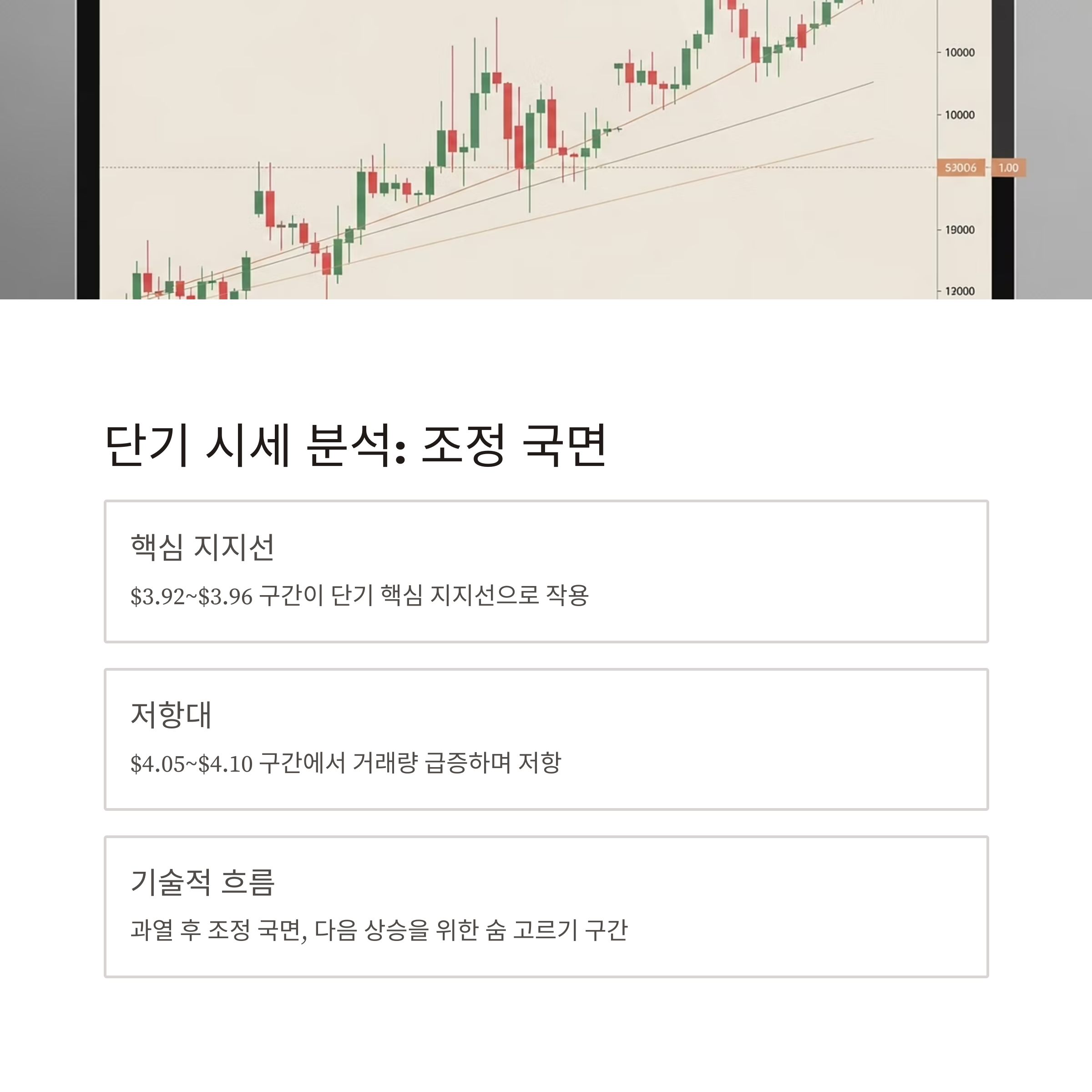이후 매도 압력과 과열 지표로 인해 $3.92~$3.96 지지선 테스트 단계에 들어섰습니다.