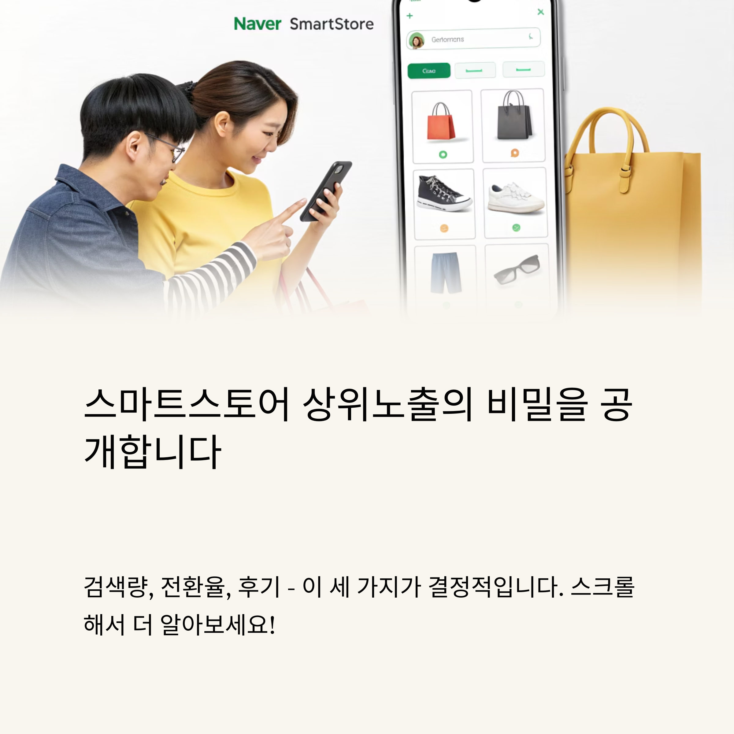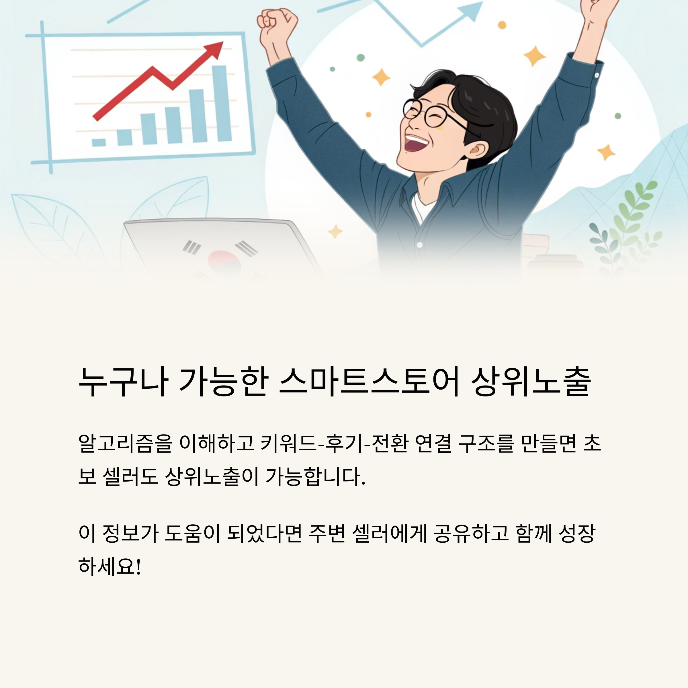 스마트스토어에서 노출 잘 되는 상품은 단순히 ‘인기 많은’ 상품이 아닙니다. 키워드 최적화, 후기 확보, 전환 설계, 상세페이지 완성도가 노출을 좌우합니다. 알고리즘을 이해하고, 노출 조건을 하나하나 채워나가면 초보 셀러도 상위에 오를 수 있습니다. 오늘 내 상품을 다시 한 번 점검해보세요. 한 줄 문구, 하나의 이미지가 노출을 바꿉니다.