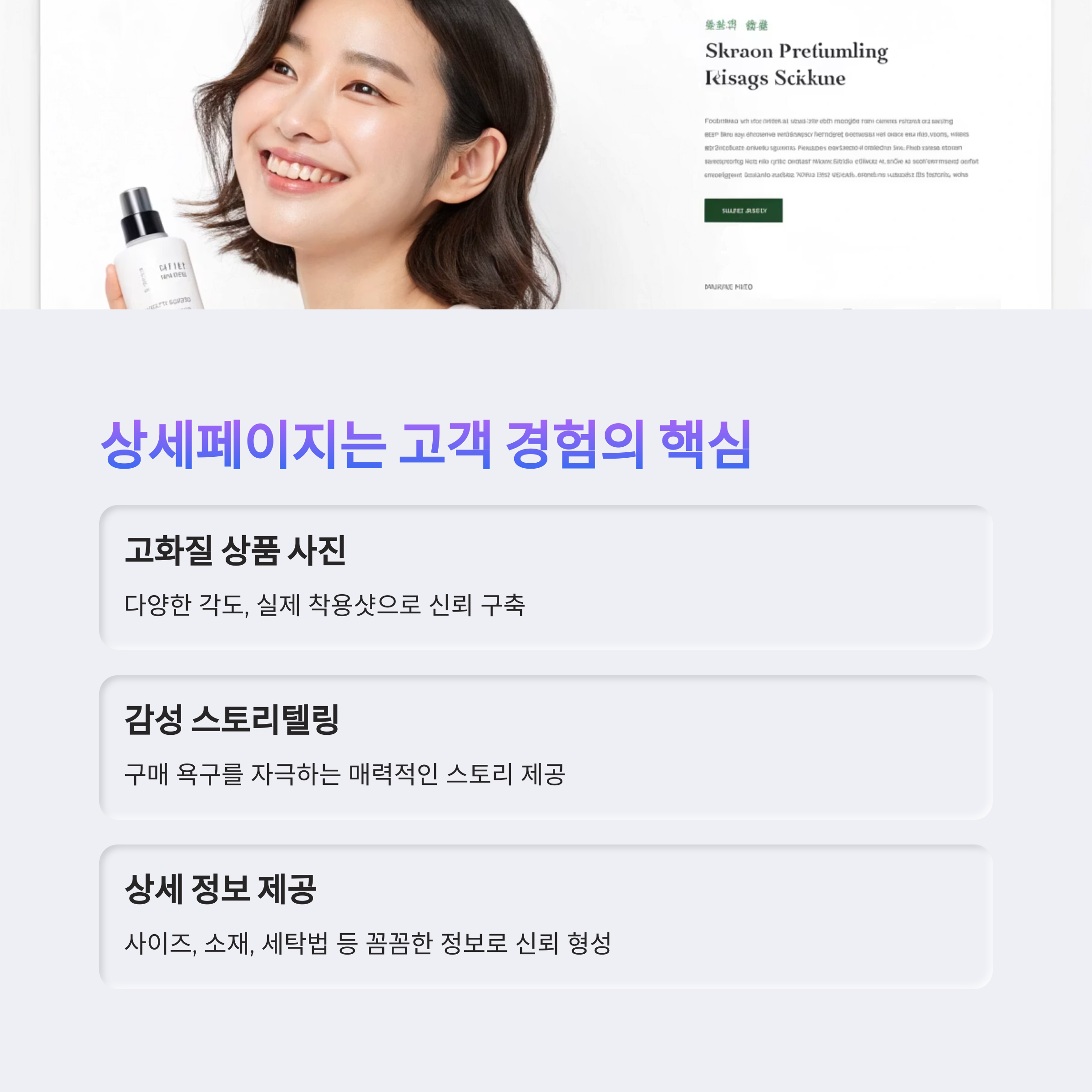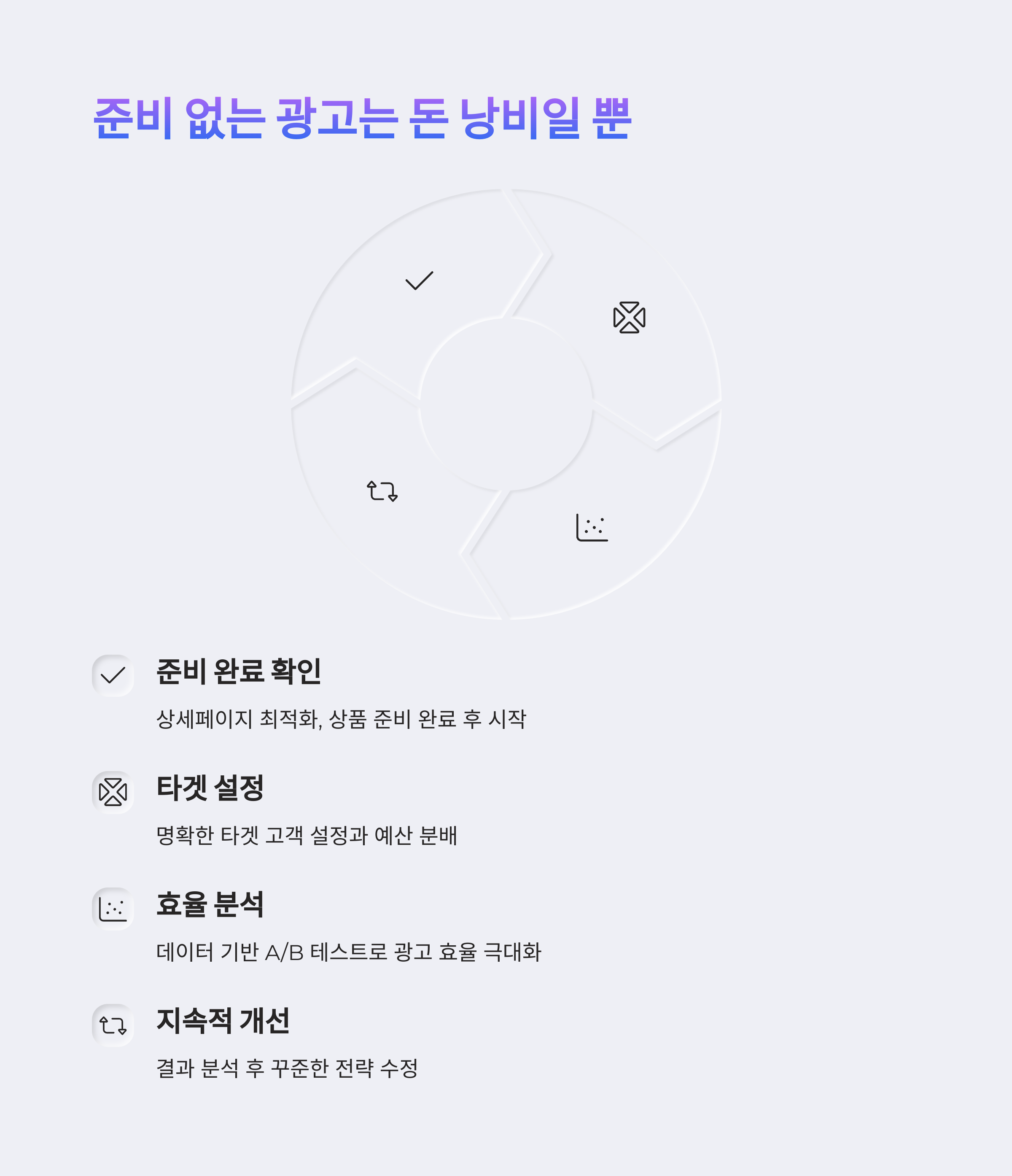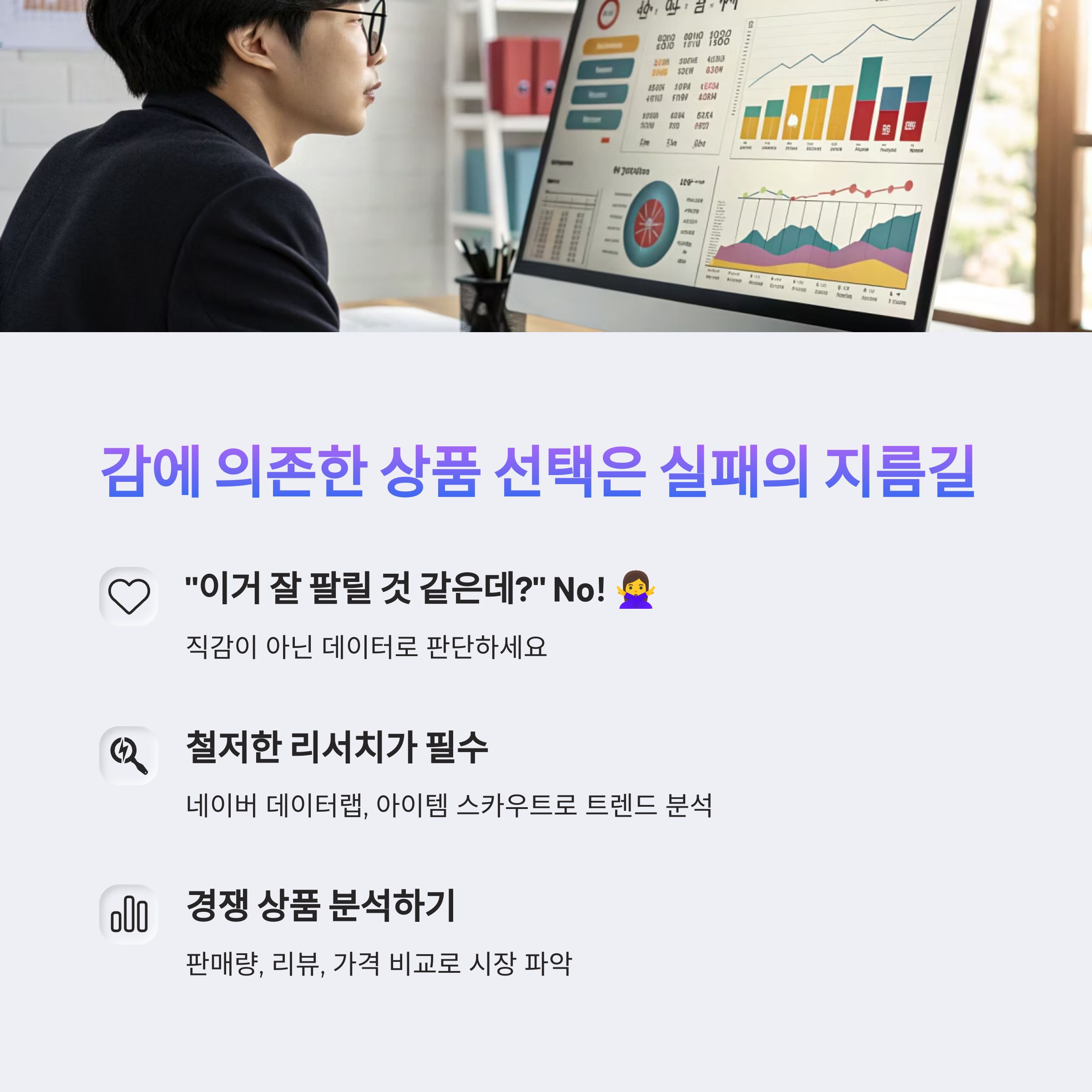 | 감이 아닌 데이터로 분석해야 성공률 증가 | 텍스트, 이미지, 구성력이 전환율을 좌우함 | 준비 없이 시작하면 예산만 낭비될 수 있음 |