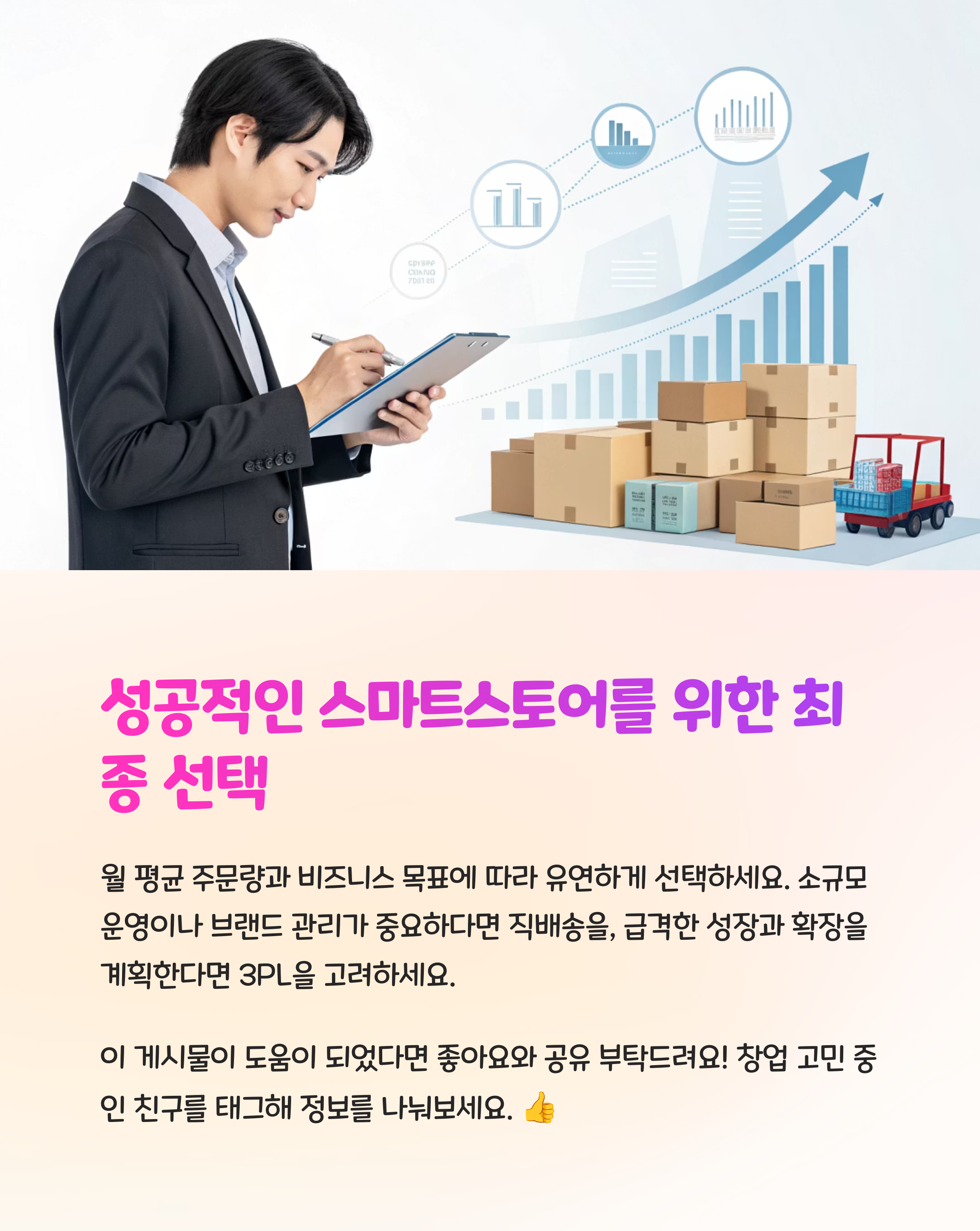 스마트스토어의 성공은 물류 전략에 달려 있습니다. 물건을 직접 손에 쥐고 시작하는 직배송은 초기 운영에 유리하지만, 사업이 커질수록 3PL을 통한 효율적인 시스템화가 필요해집니다. 내 시간과 에너지를 어디에 집중할 것인지 고민해보고, 지금 나에게 맞는 선택을 해보세요. 결국 중요한 건 ‘성장에 최적화된 구조’를 갖추는 것입니다.