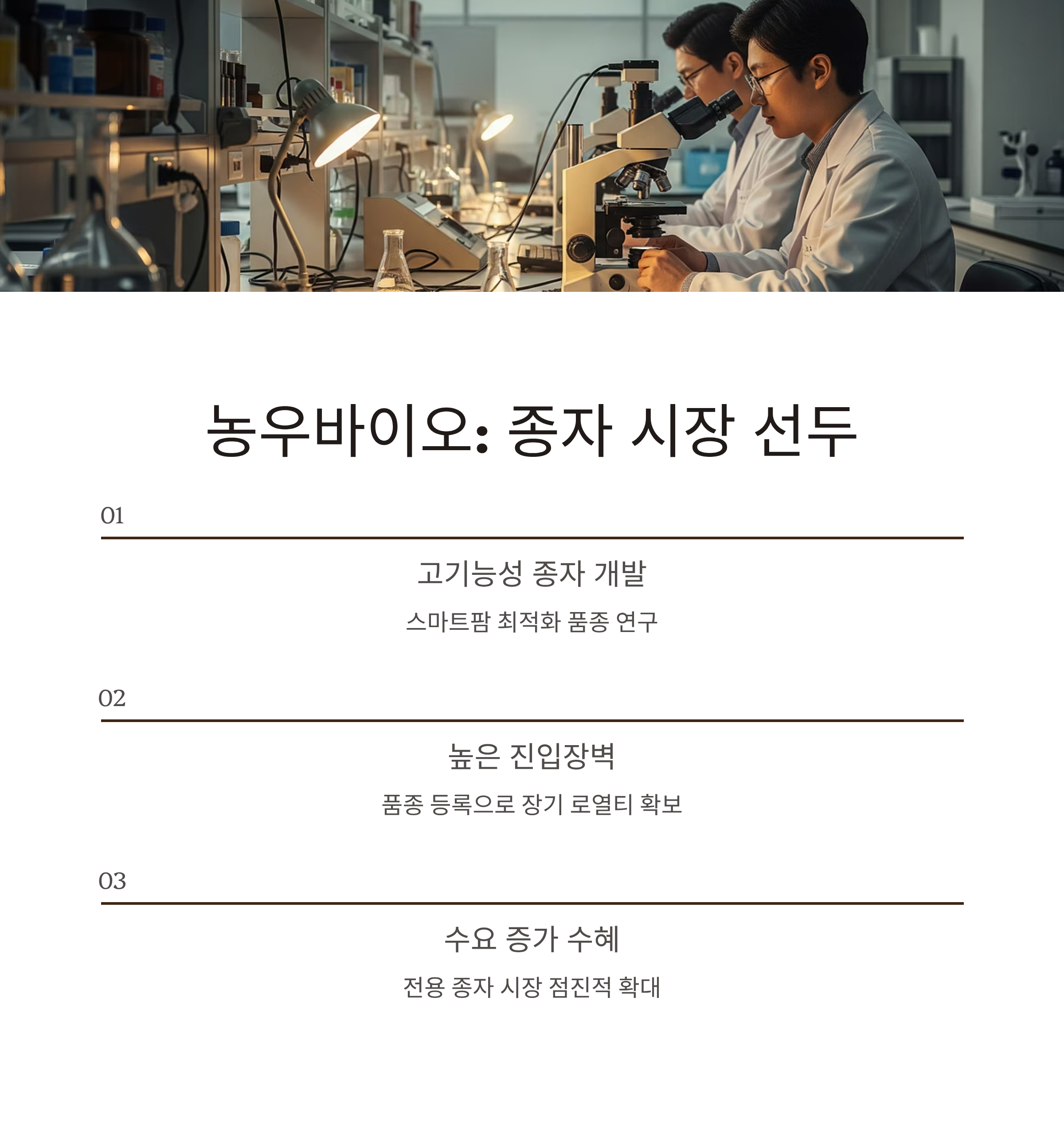 | 농우바이오 | 종자 개발 | 스마트팜 최적 종자 개발 및 공급 | 농업시장 경기 민감, 수출입 규제 |