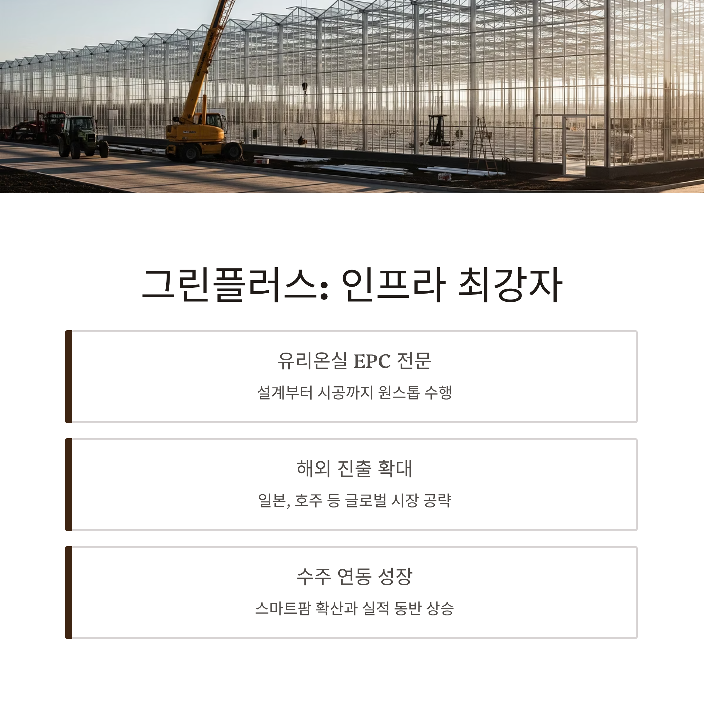 | 그린플러스 | 인프라 구축 | 유리 온실 시공, 기자재 공급 | 수주 공백, 원자재 단가 변동 |