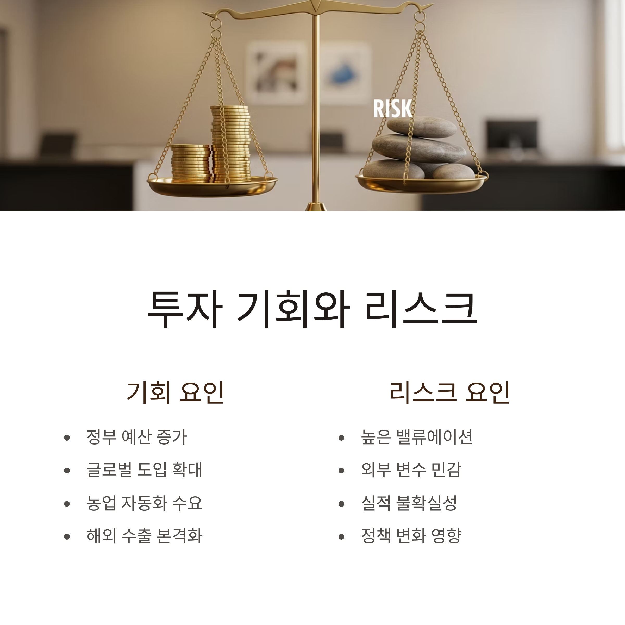 | 대동 | 스마트 농기계 | 자율주행 농기계, 노지 농업 자동화 | 기술 상용화 속도, 정책 의존도 |