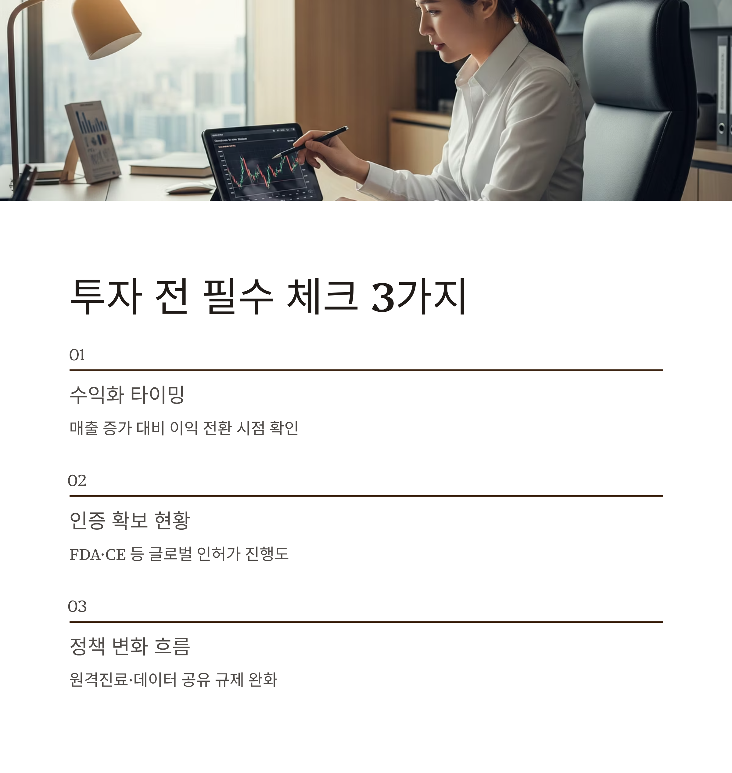 → 원격진료, 데이터 공유 등 디지털헬스 정책 변화가 종목별 상승 모멘텀에 영향을 미칠 수 있습니다.