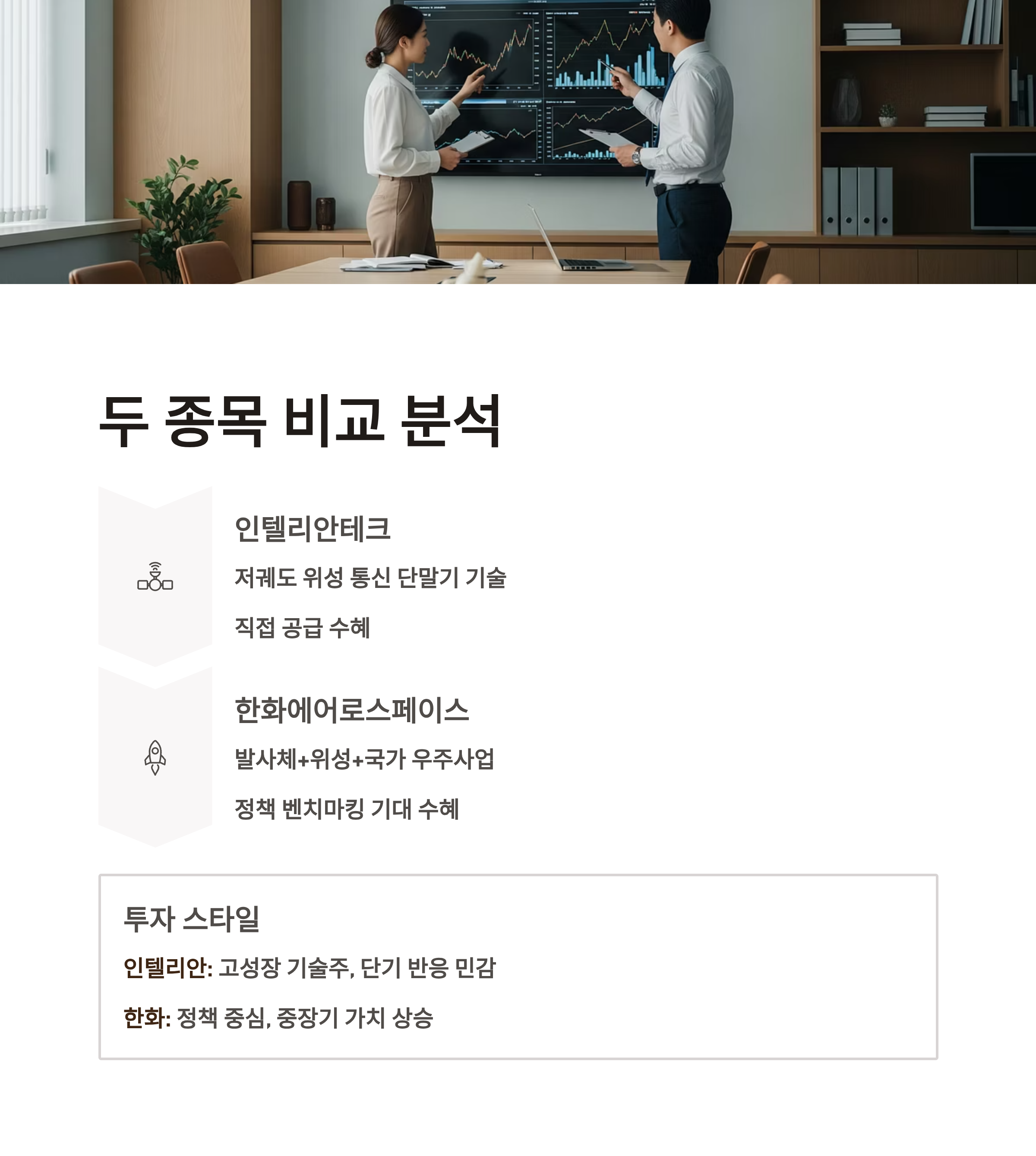 두 종목은 각각 매력이 다릅니다. 인텔리안테크는 단기 주가 탄력성이 높고, 한화에어로스페이스는 정책+기술 주도력으로 장기 우위를 보입니다.