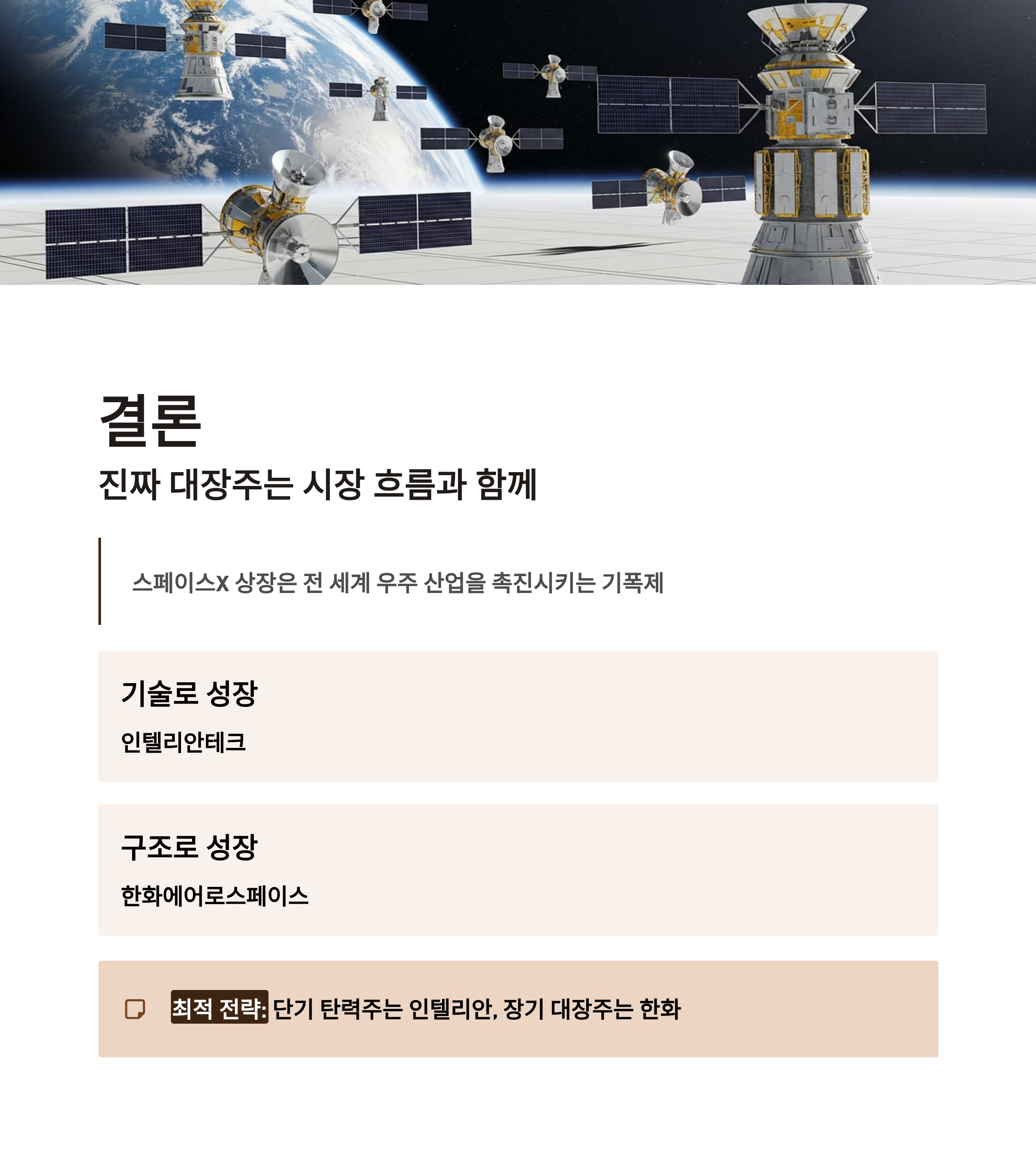 | 우주 밸류체인 | 발사체, 위성, 방산, 위성서비스까지 완전 수직계열화 |