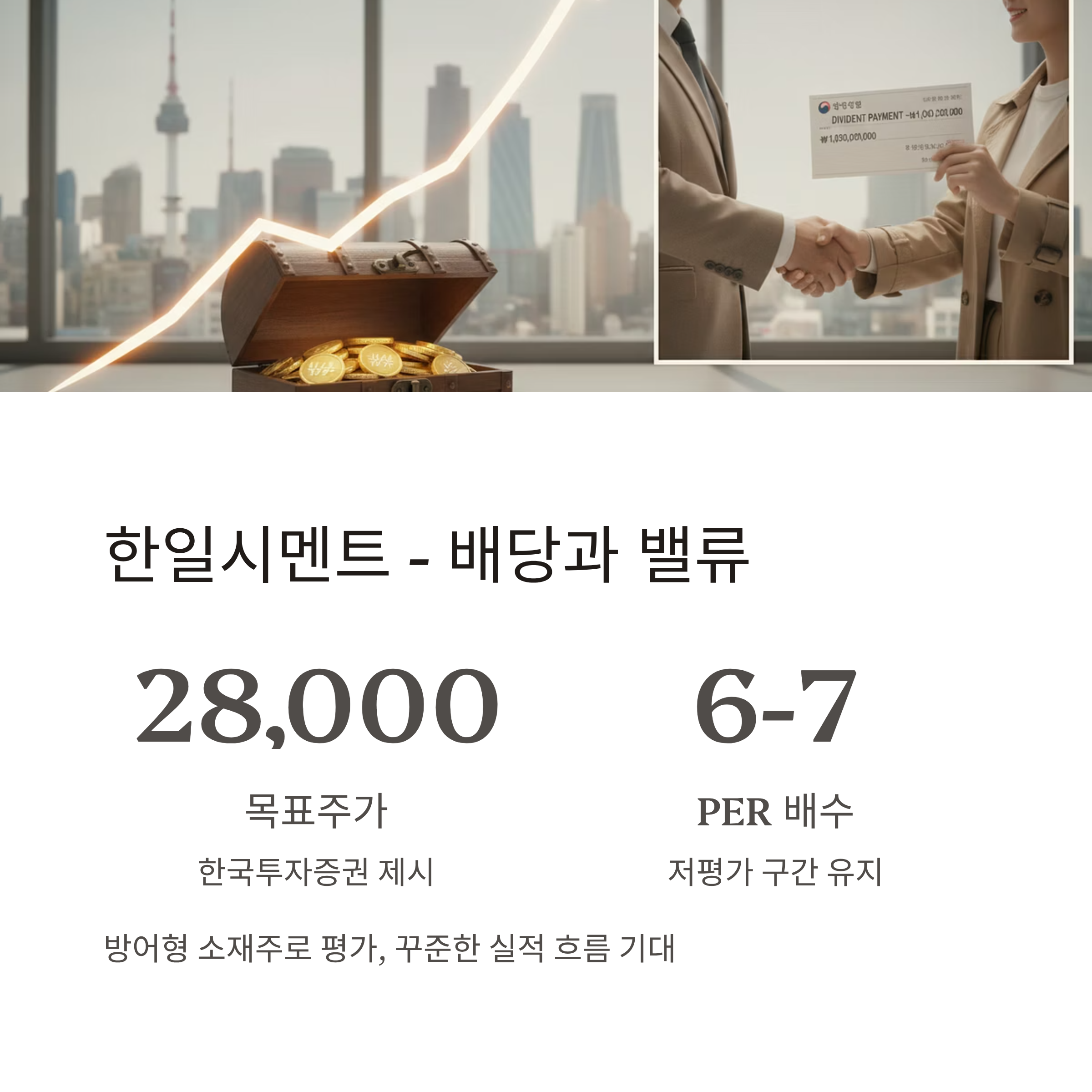 | 한일시멘트 | 한국투자증권 28,000원 (2025.11) | 약 1조 1천억 원 | 배당 매력과 안정적 실적 흐름 강조 |