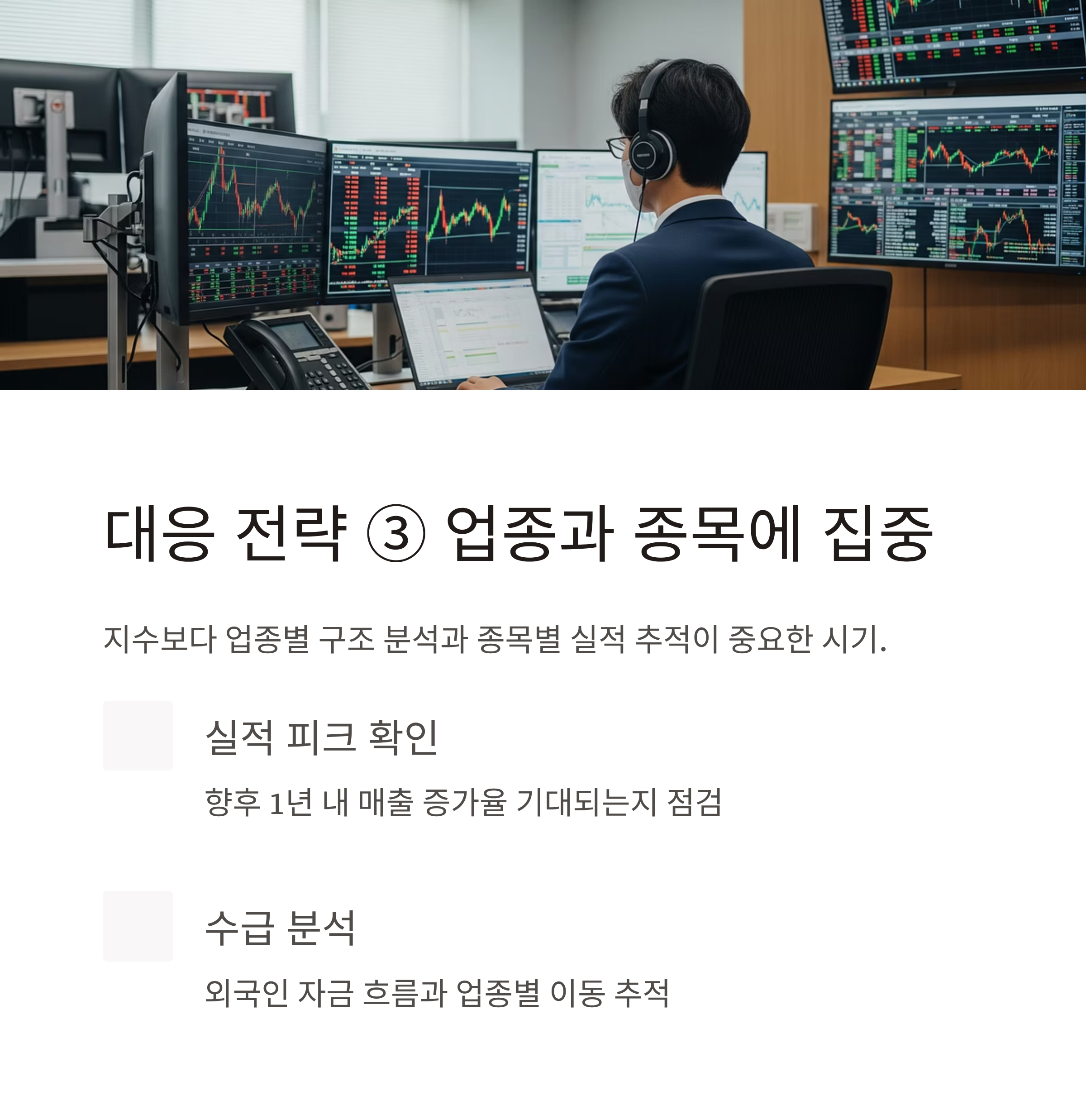 레버리지 활용 비중이 높거나, PER·PBR이 지나치게 높은 종목은 먼저 점검해야 합니다. 변동성이 커지는 구간에서는 배당주, 현금흐름 우수 기업, 저평가 우량주 비중을 늘리는 것이 상대적으로 안정적인 대응이 될 수 있습니다.