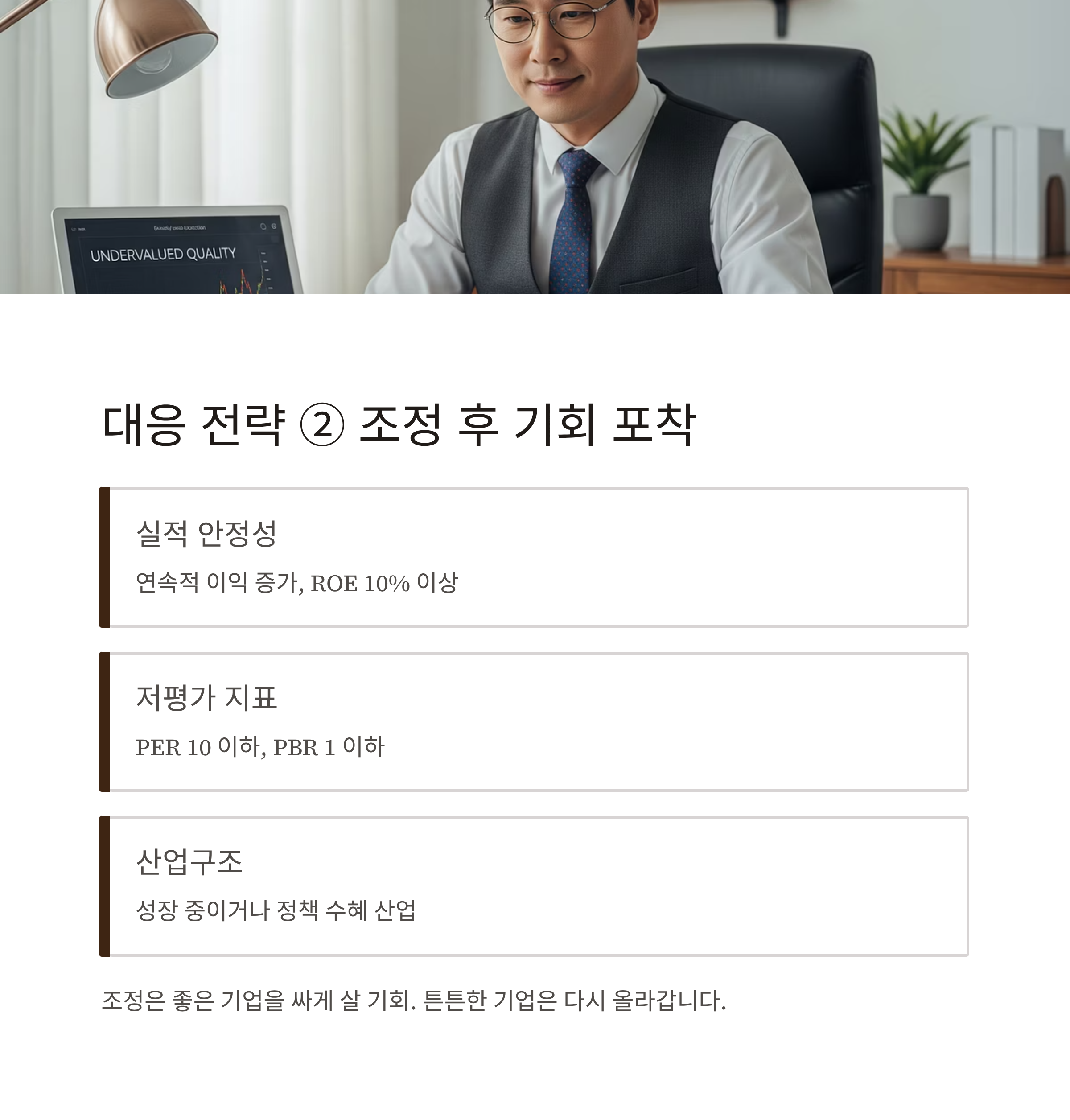 조정 국면이 찾아오면, 실적이 확실하고 산업 사이클 상 회복이 기대되는 종목들을 미리 분석해 두세요. 배당이 꾸준한 기업, 수출이 강한 기업, 또는 중소형 우량주는 조정장에서 살아남을 가능성이 높습니다.