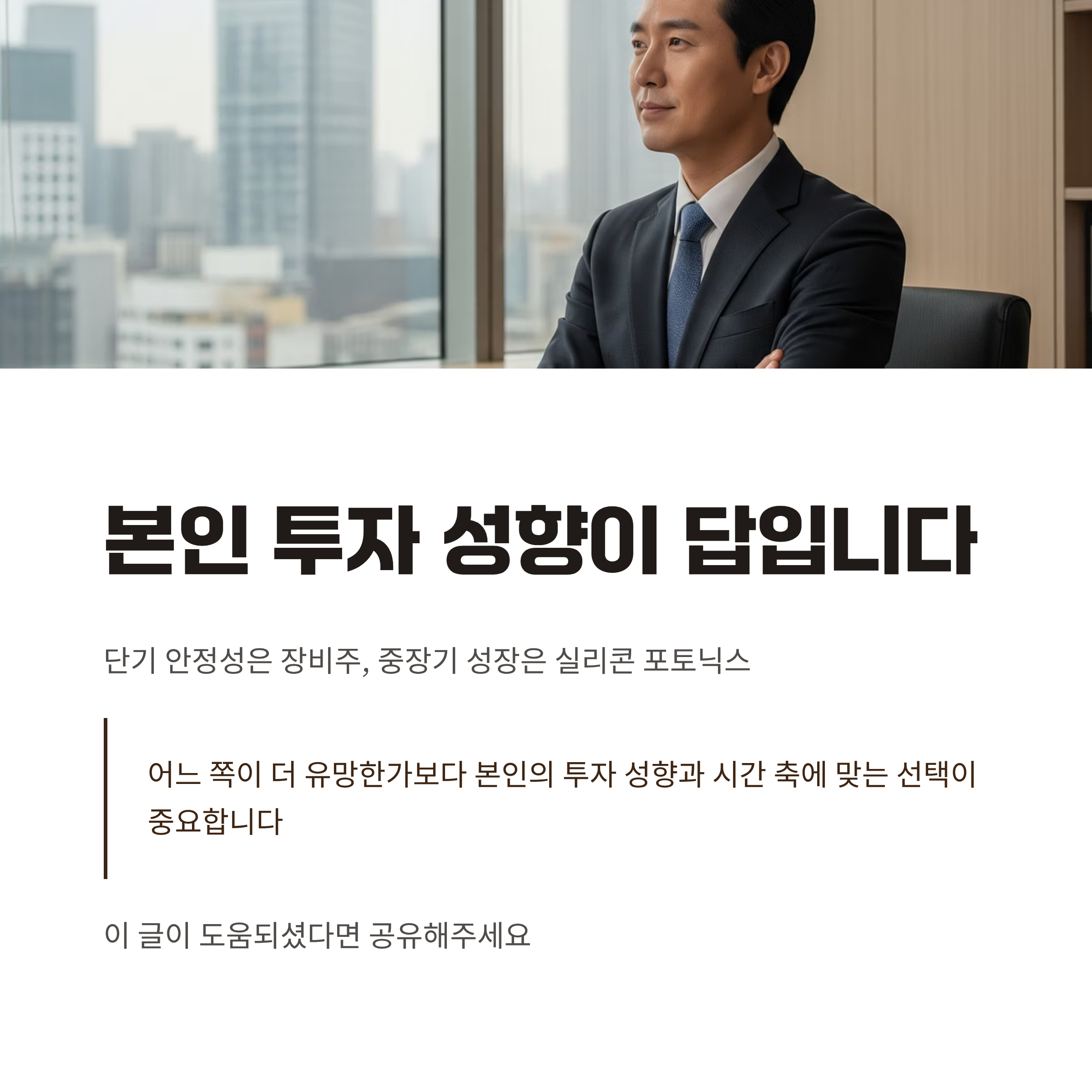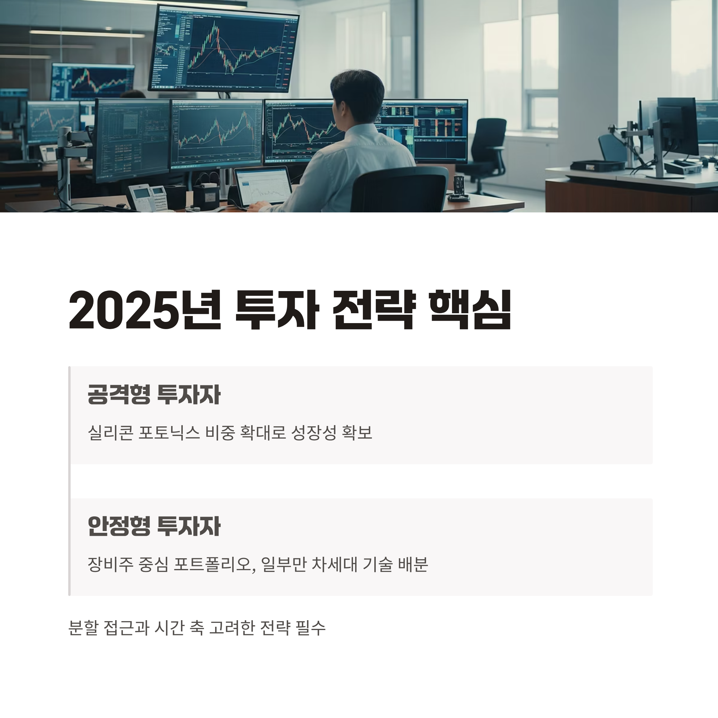 공격적인 투자자라면 실리콘 포토닉스 비중을 높여 성장성을 노릴 수 있습니다. 안정적인 자산 운용을 원한다면 장비주를 중심으로 하고 일부만 차세대 기술에 배분하는 전략이 현실적입니다.