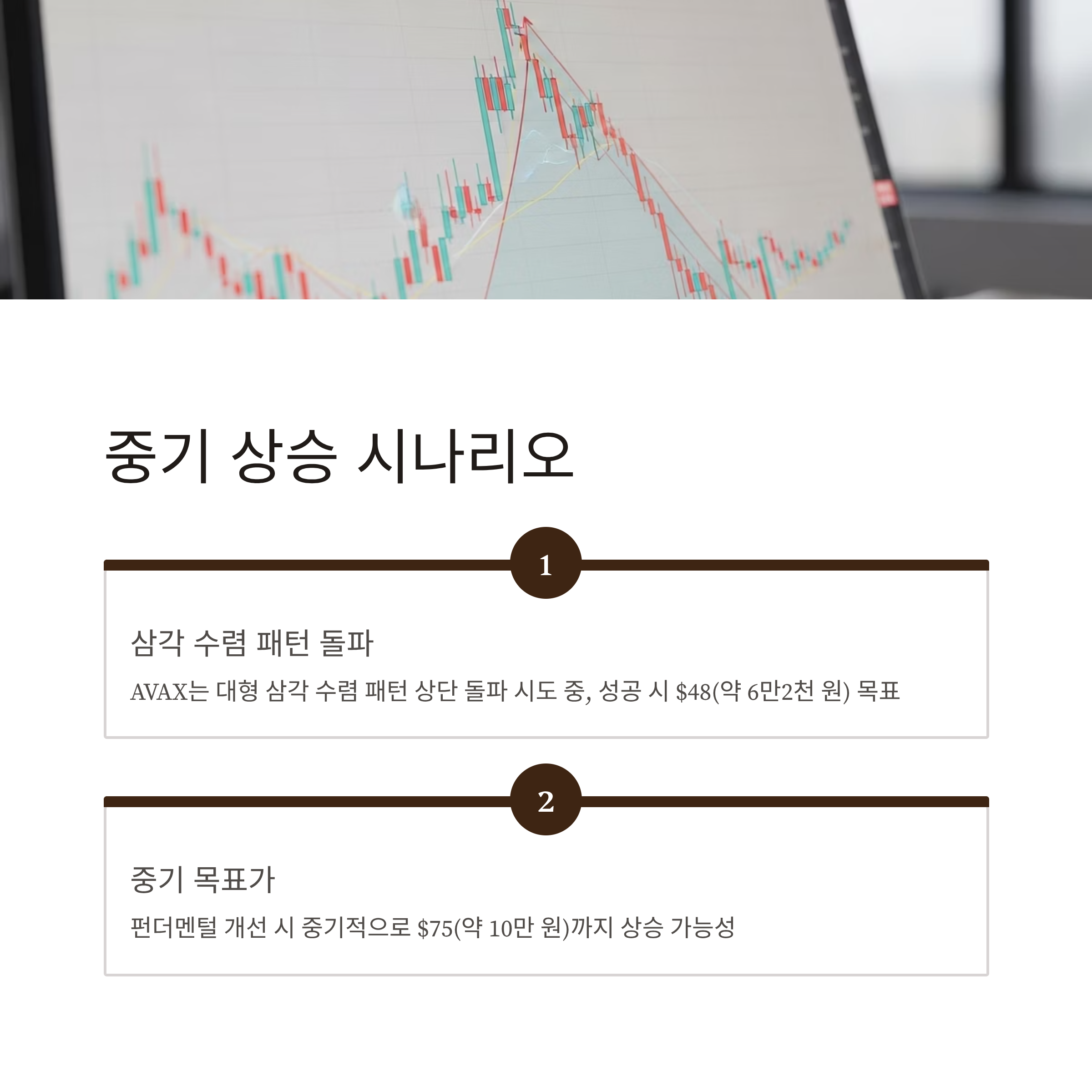 돌파 성공 시 기술적 목표는 $48(약 6만2천 원), 중기적으로는 $75(약 10만 원)까지 열릴 수 있습니다.