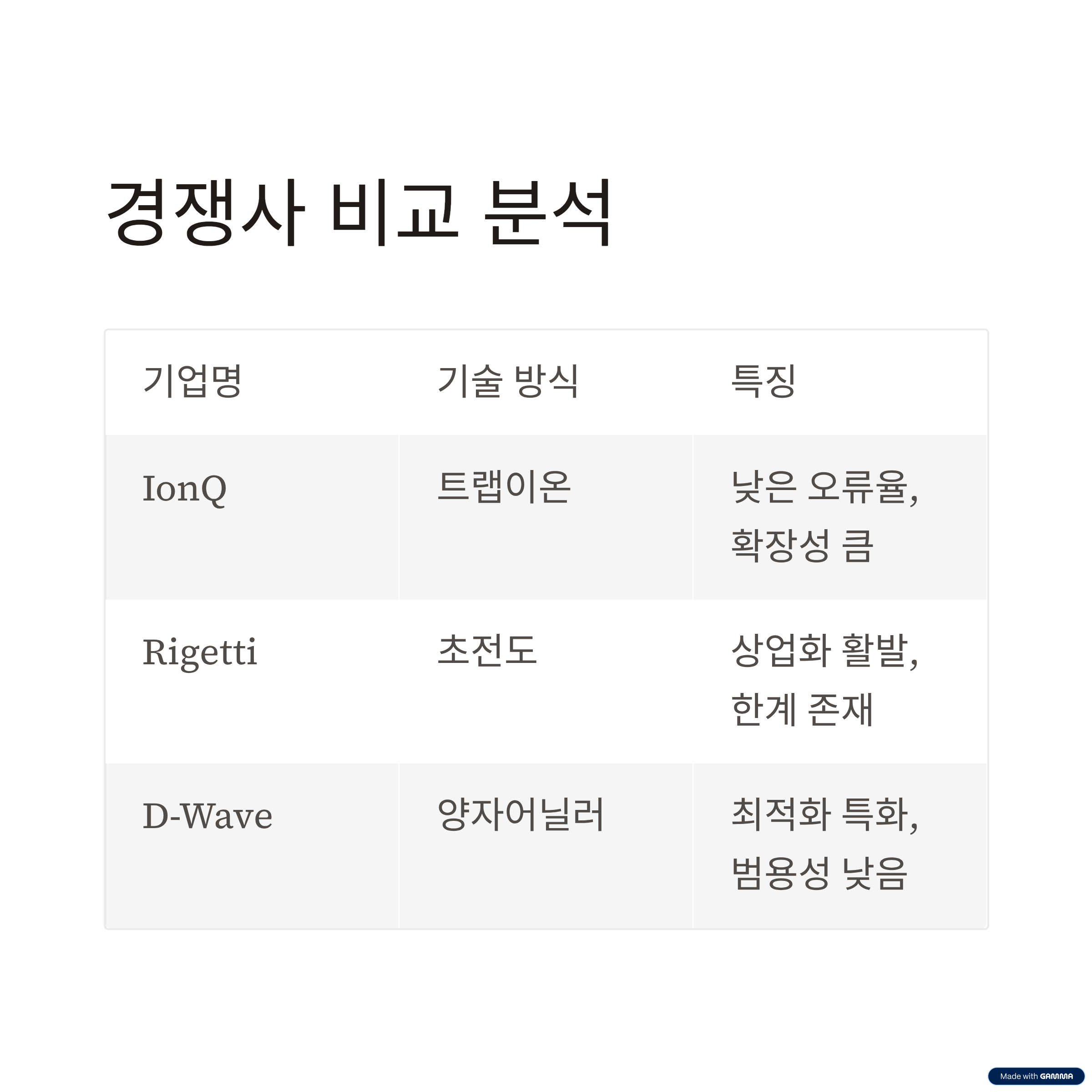 IonQ는 기술 방식에서 상대적으로 더 높은 확장성과 정밀도를 확보하고 있으며, 전략적 인수합병과 함께 양자네트워크 분야까지 진출하려는 움직임이 눈에 띕니다.