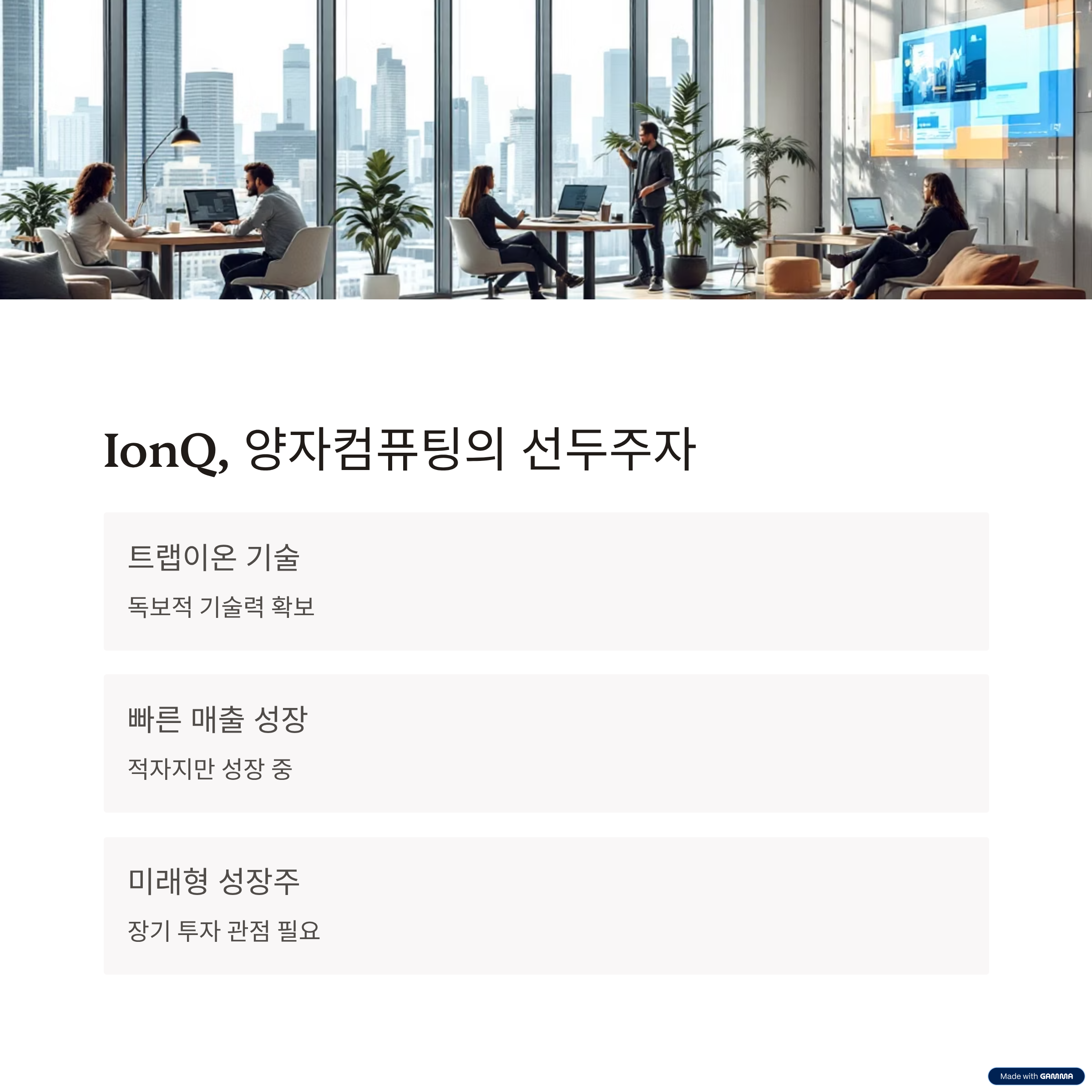 지금 IonQ에 투자한다는 건 ‘가능성’에 투자하는 것입니다. 양자컴퓨팅이라는 신기술, 그 안에서 기술력과 전략을 갖춘 IonQ가 업계를 주도할 수 있다는 믿음이 전제되어야 합니다.