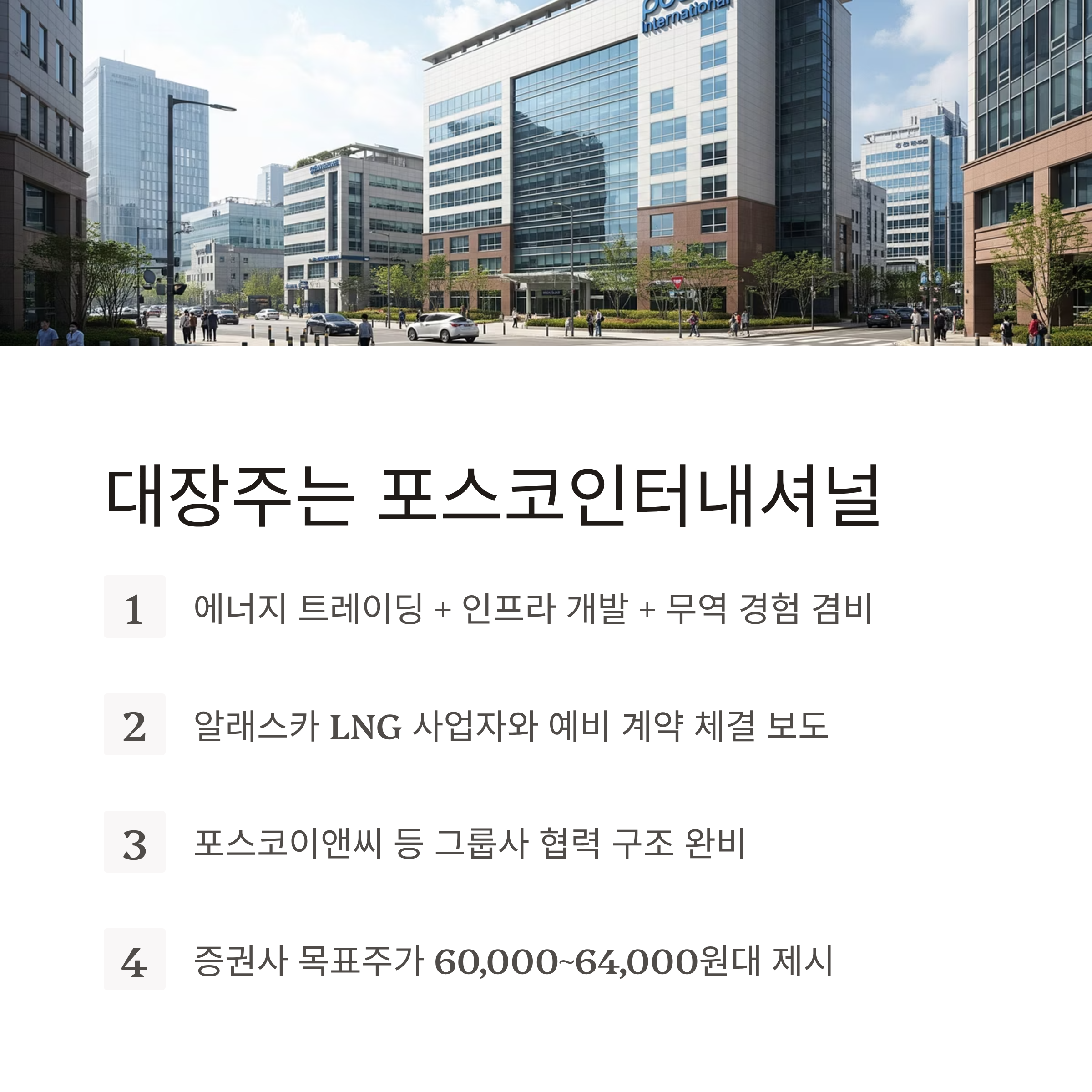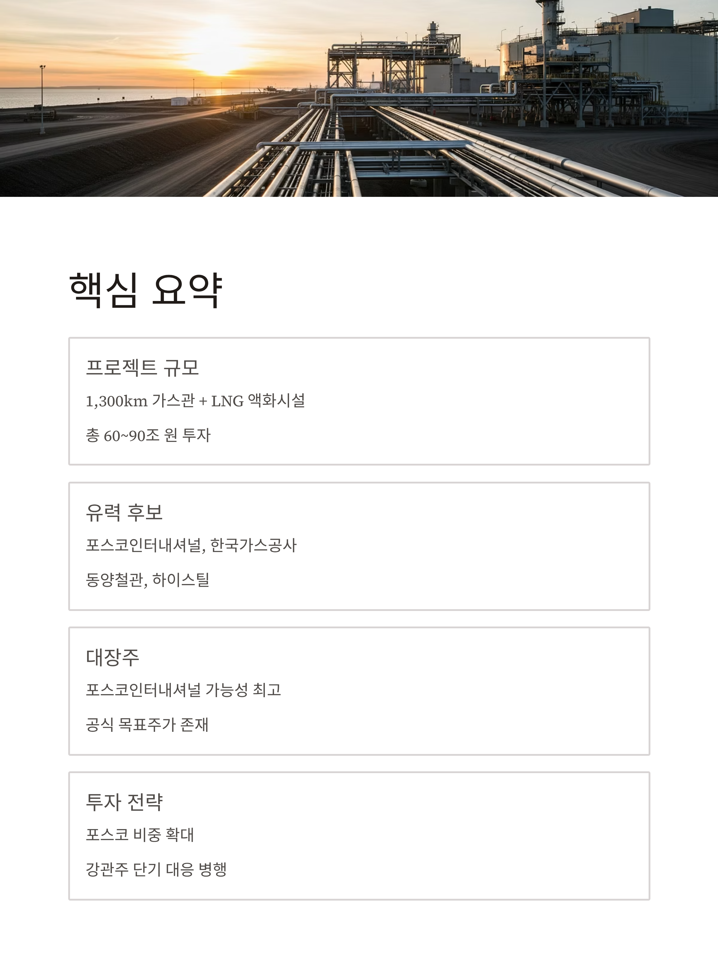 | 포스코인터내셔널 | 55,000 ~ 70,000원대 | 에너지 개발 + 인프라 건설 + 무역 3박자 가능. LNG 밸류체인 구축 중 | 해외 사업 리스크 / 참여 확정 전 단계 |