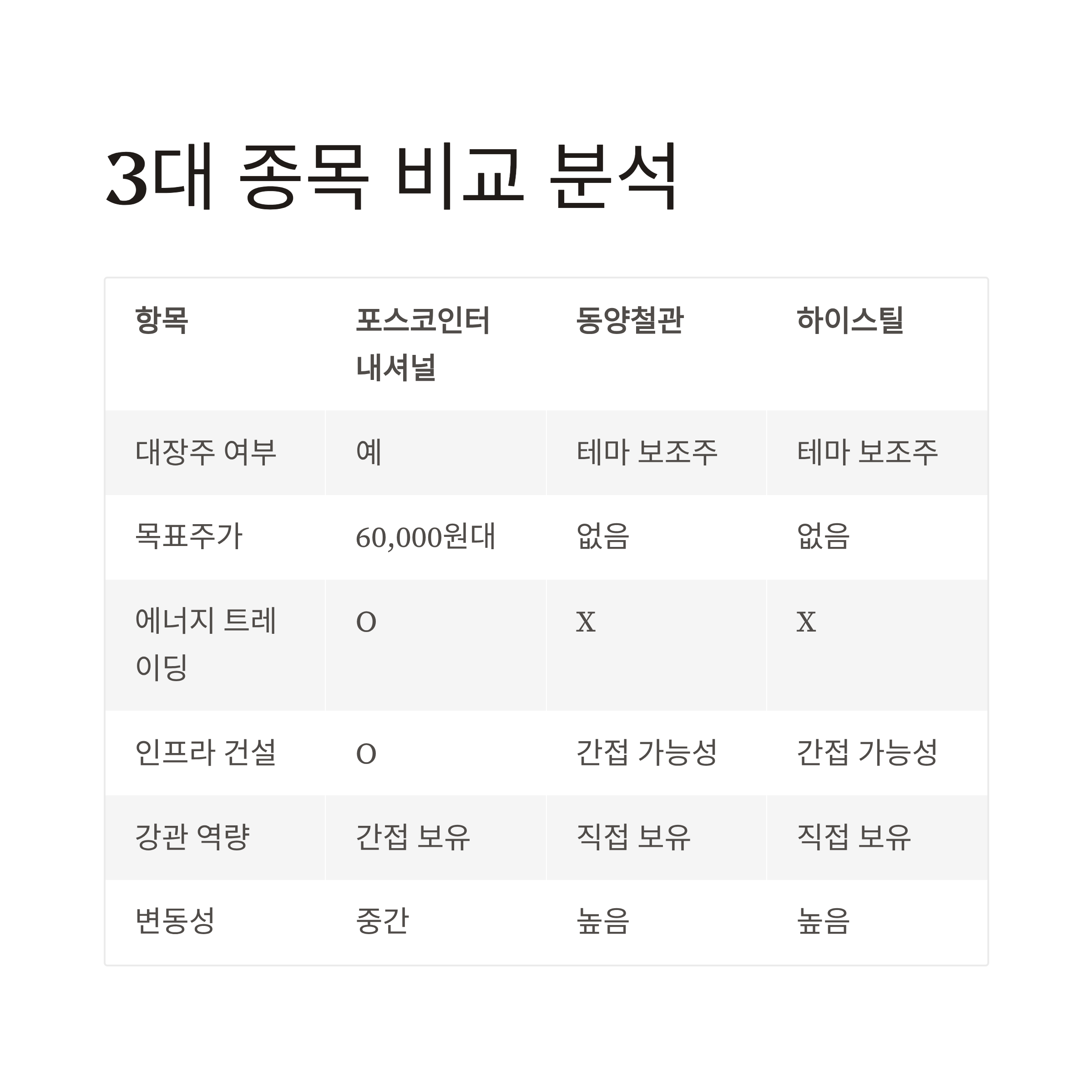 | 인프라 건설 참여 | O (포스코이앤씨와 협력 구조) | 간접 참여 가능성 | 간접 참여 가능성 |