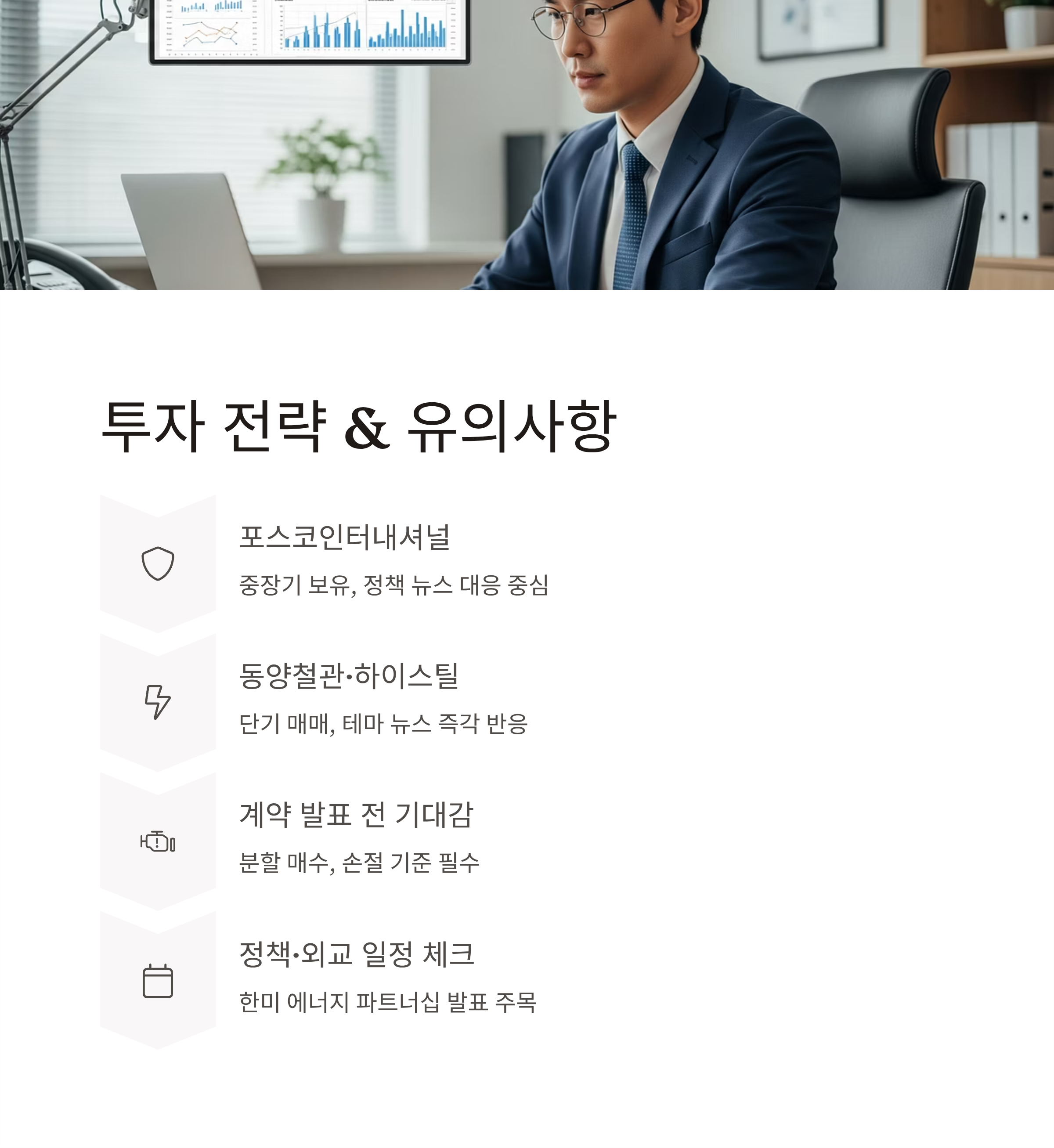 중장기 보유 + 정책 뉴스 대응 중심 접근 - 동양철관 / 하이스틸 등은 테마 뉴스에 즉각 반응
