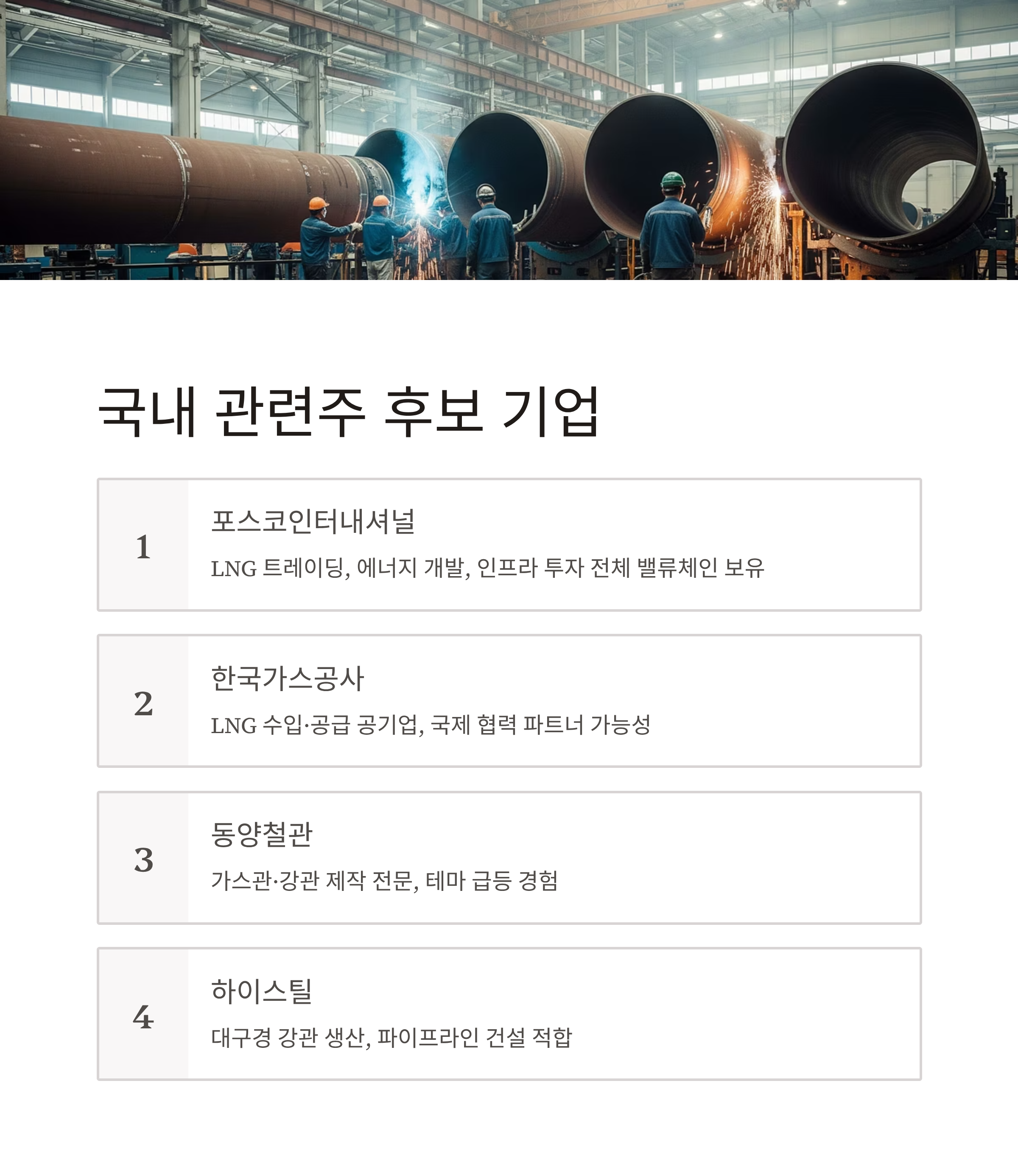 | 세아제강지주 / 넥스틸 | 강관·철강 기업, 대형 파이프라인 납품 경험 보유 | 테마 수혜 기대주. 실적 변동성 있음 |