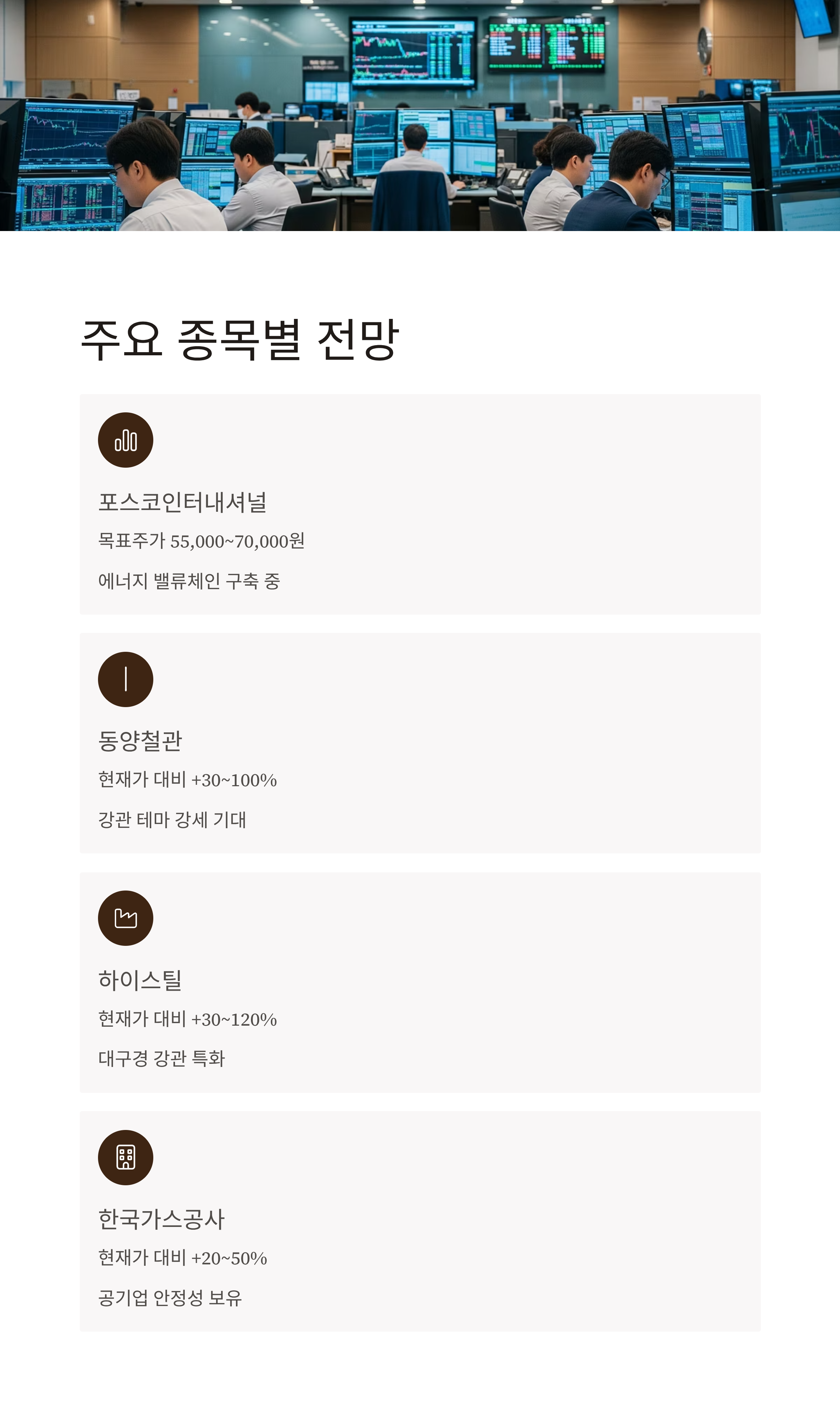 | 동양철관 | 현재가 대비 +30~100% 범위 | 강관 테마 강세. 프로젝트 수혜 시 매출 성장 기대 | 실적 적자 / 원자재 변동성 큰 업종 |