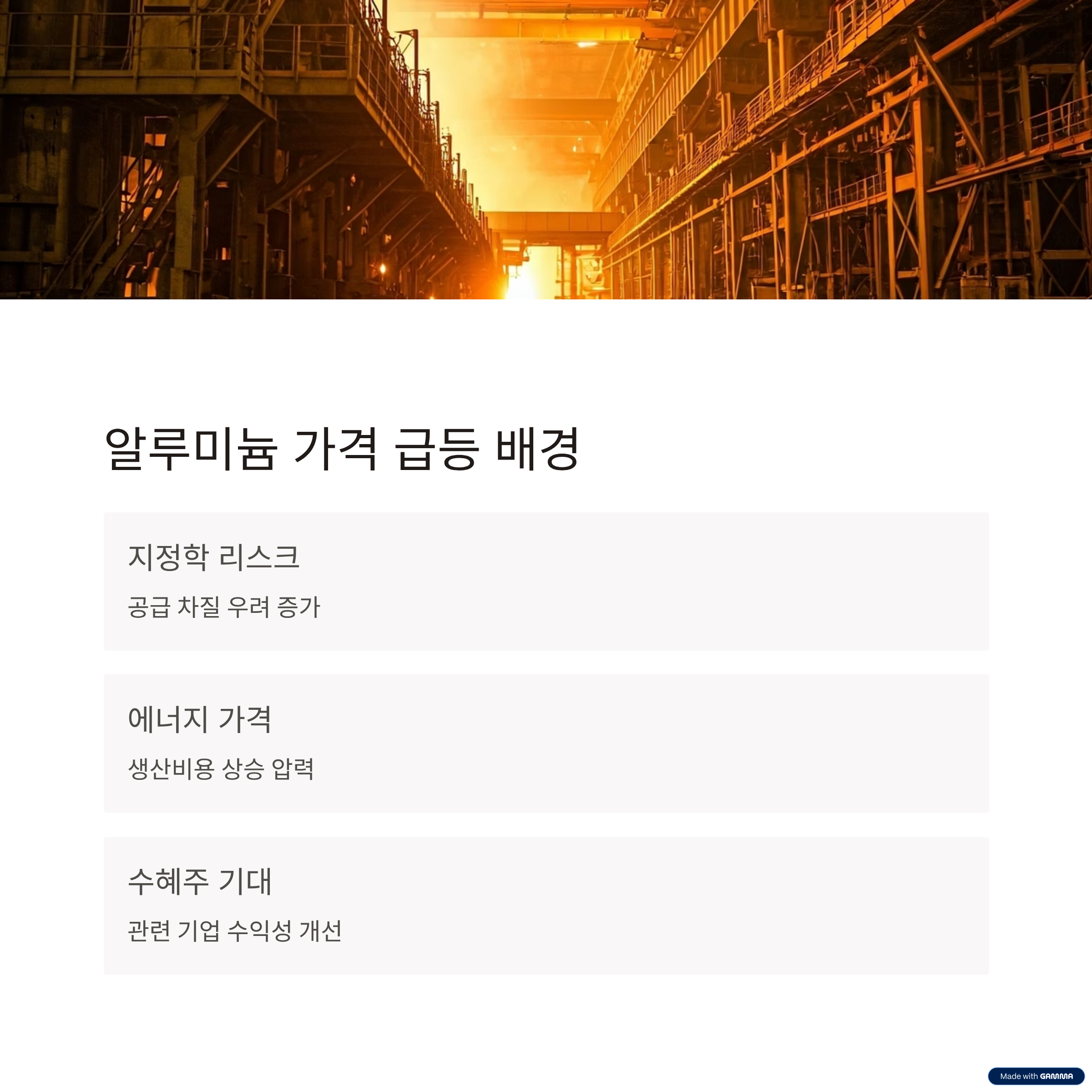 - 에너지 비용 상승: 알루미늄 생산에는 전력이 필수인데,
