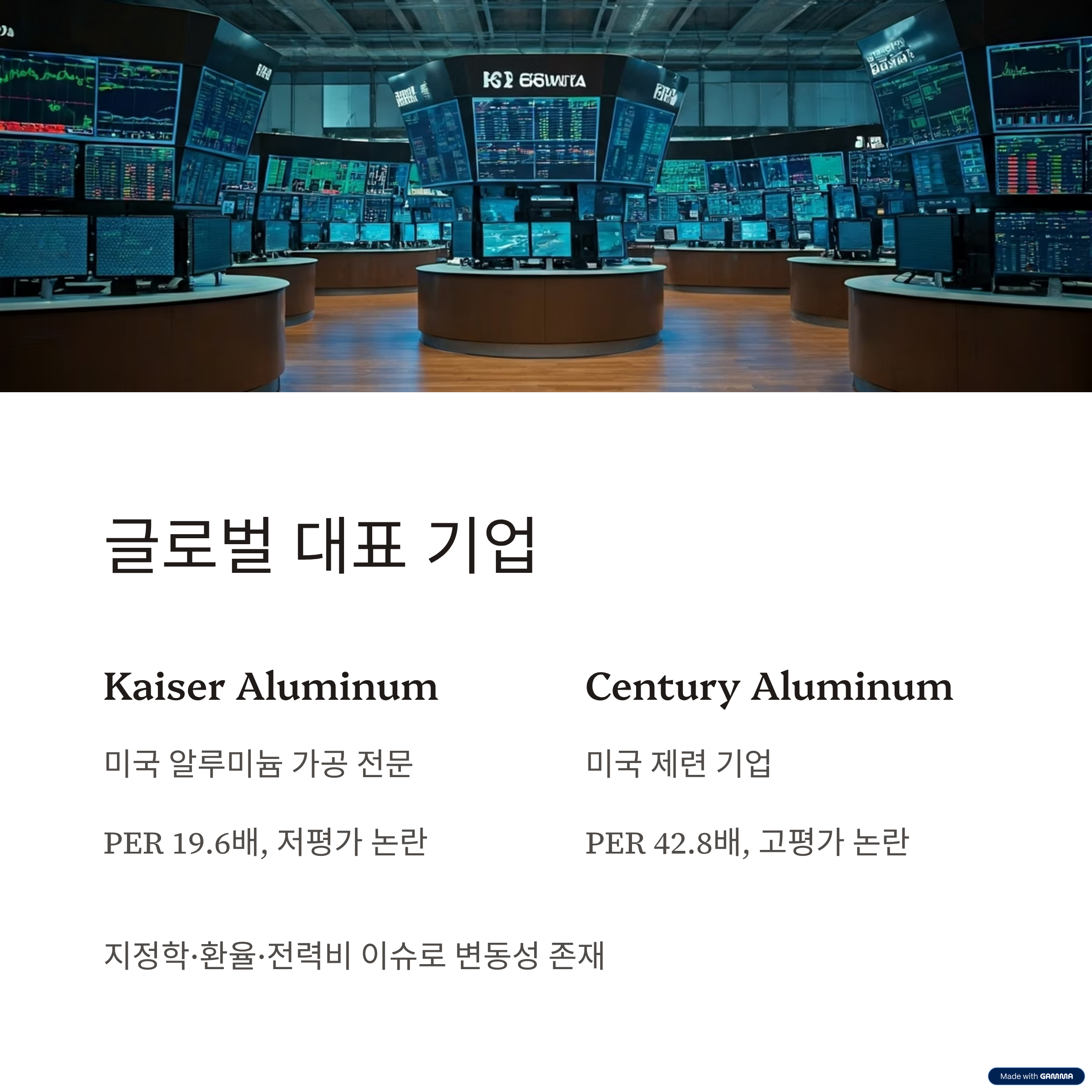| Century Aluminum | 美 제련 기업, 알루미늄 가격 상승에 민감, PER 약 42.8배로 고평가 논란도 |