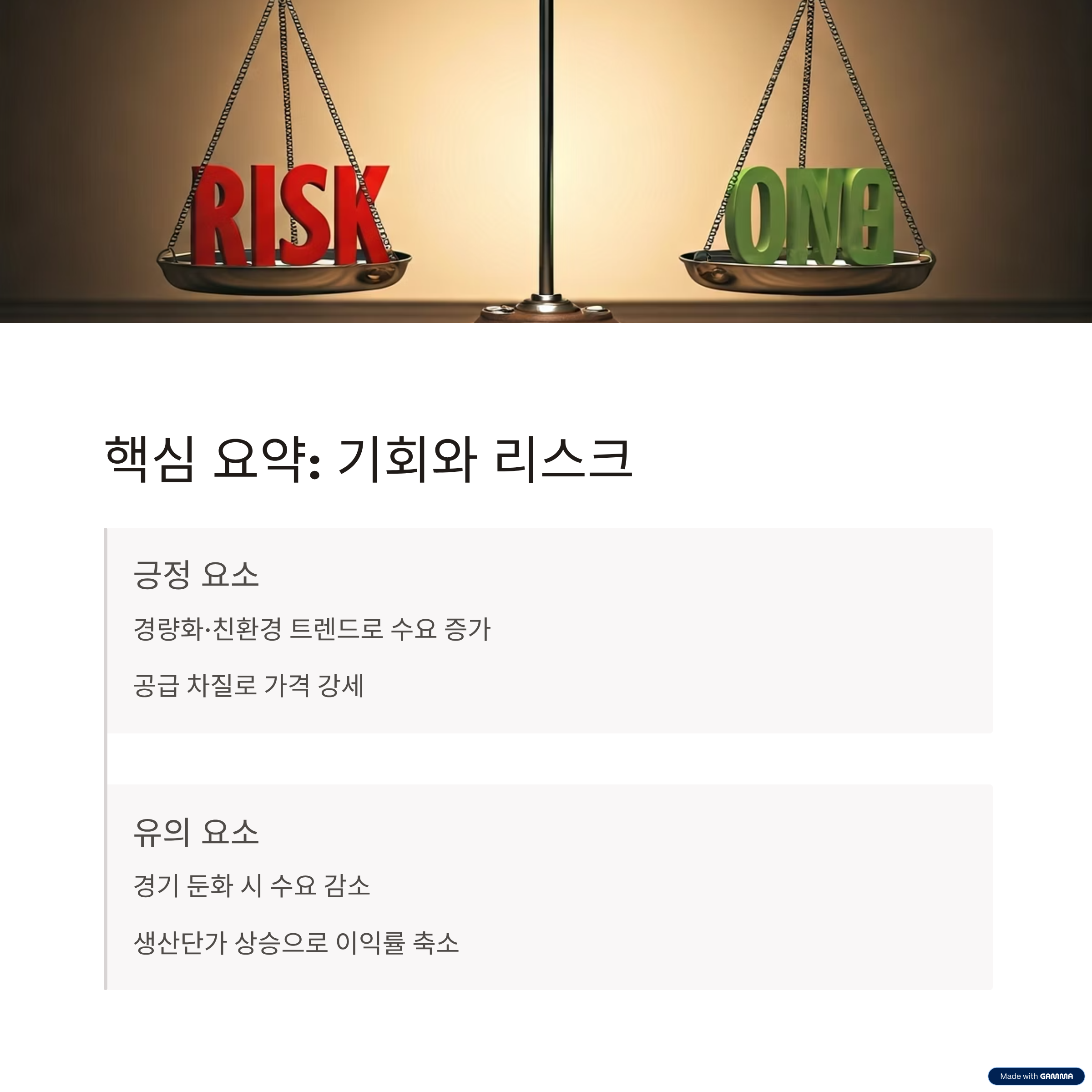 | 업황 측면 | 경량화·친환경 트렌드 → 수요 증가 | 경기 둔화 시 수요 꺾일 가능성 |