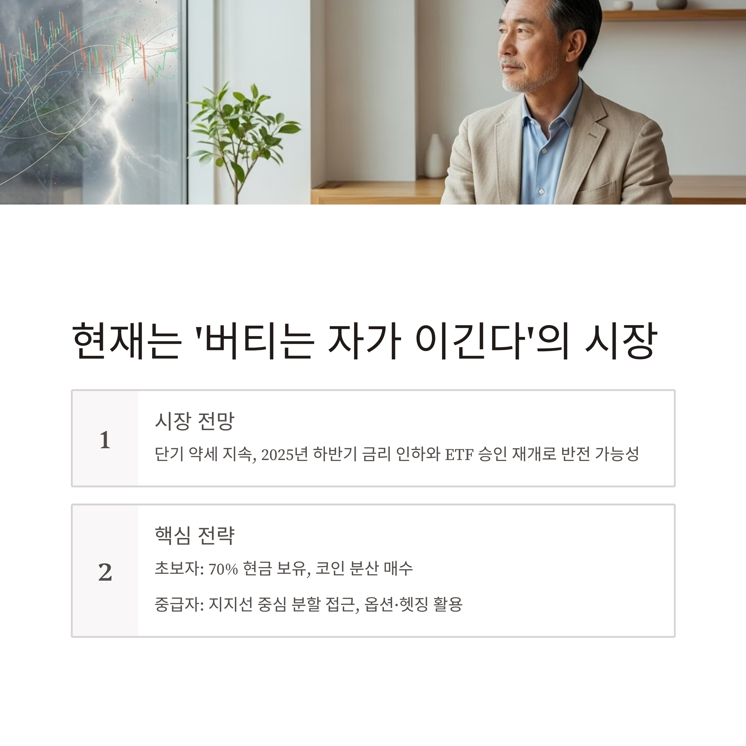 단기적으로는 약세장 국면이 지속될 수 있으나, 2025년 하반기 이후 금리 인하 가능성, ETF 승인 재개 등 외부 호재에 따라 시장 분위기가 반전될 여지도 있습니다. 따라서 지금은 무리한 투자보다는 다음 반등을 준비하는 시점입니다.