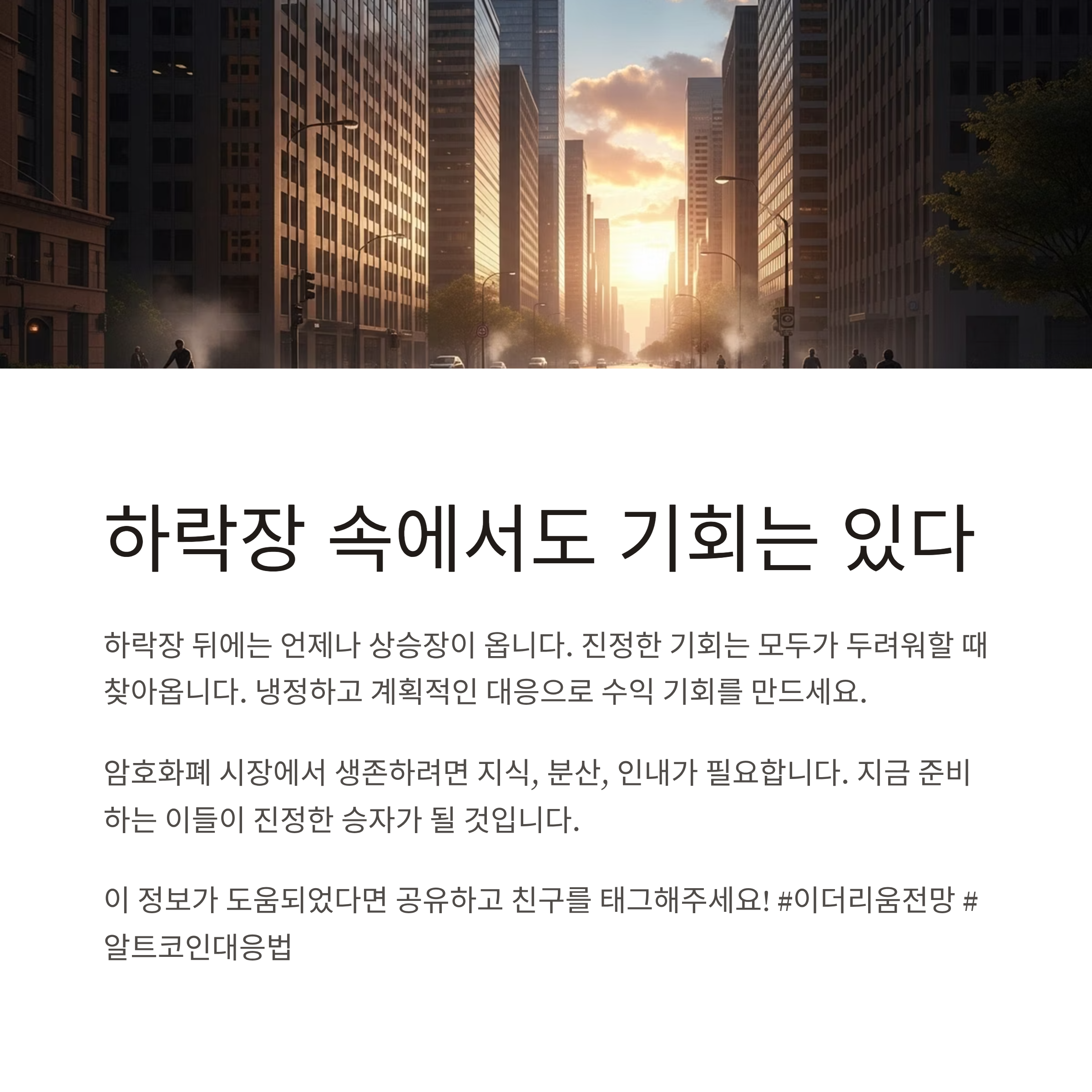 시장은 반복됩니다. 하락장 뒤에는 언제나 상승장이 오며, 진정한 기회는 모두가 두려워할 때 옵니다. 이번 하락장 역시 기회가 될 수 있으나, 중요한 것은 “급하지 않게, 그러나 철저하게 준비하는 것”입니다. 주요 알트코인별 전략과 핵심 가격 구간을 기억하고, 냉정하고 계획적으로 대응한다면 하락장에서도 소중한 수익 기회를 만들 수 있습니다.