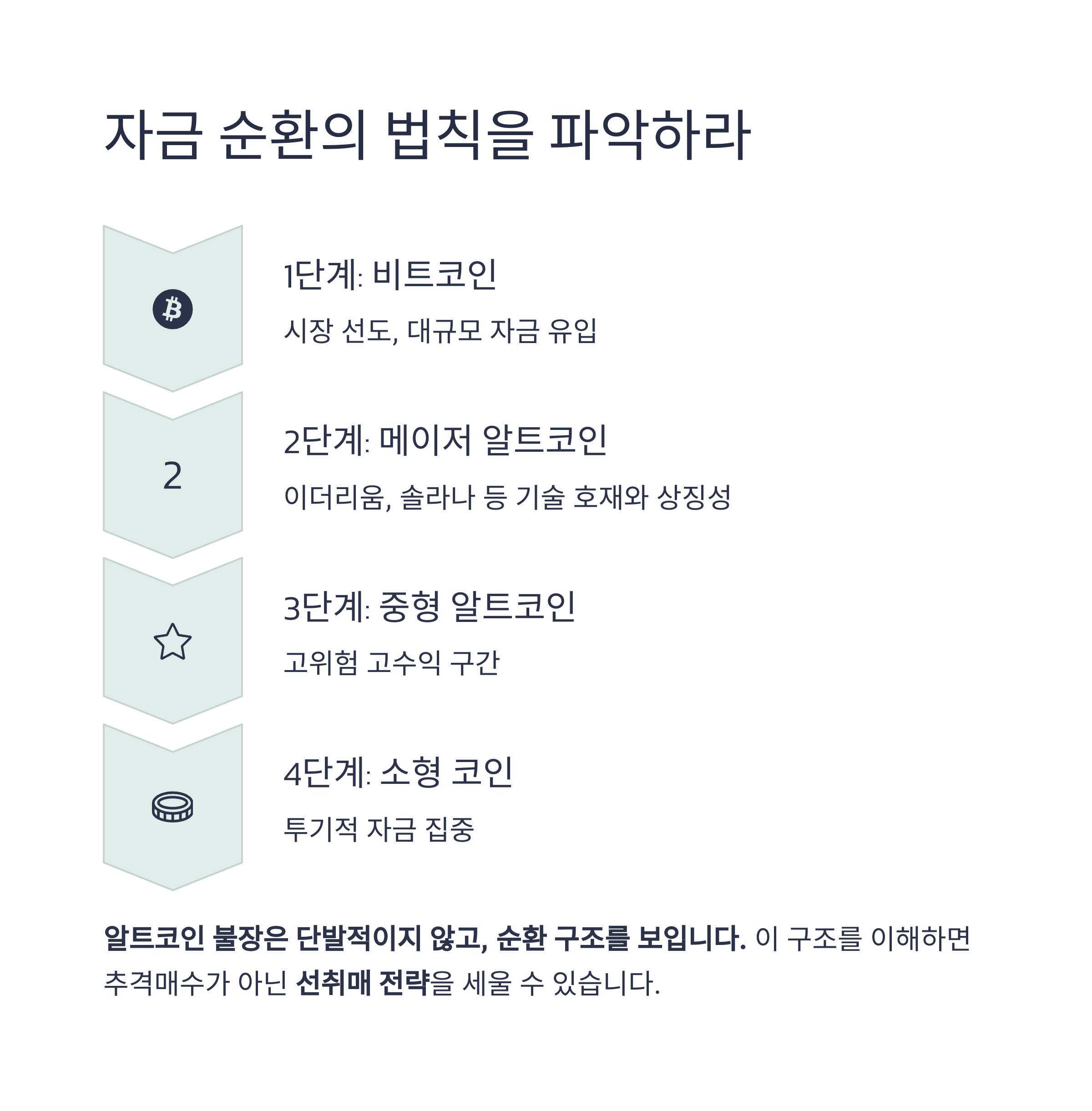 비트코인 → 메이저 알트코인(이더리움, 솔라나 등) → 중소형 알트 → 김치코인 순으로 자금이 이동합니다.