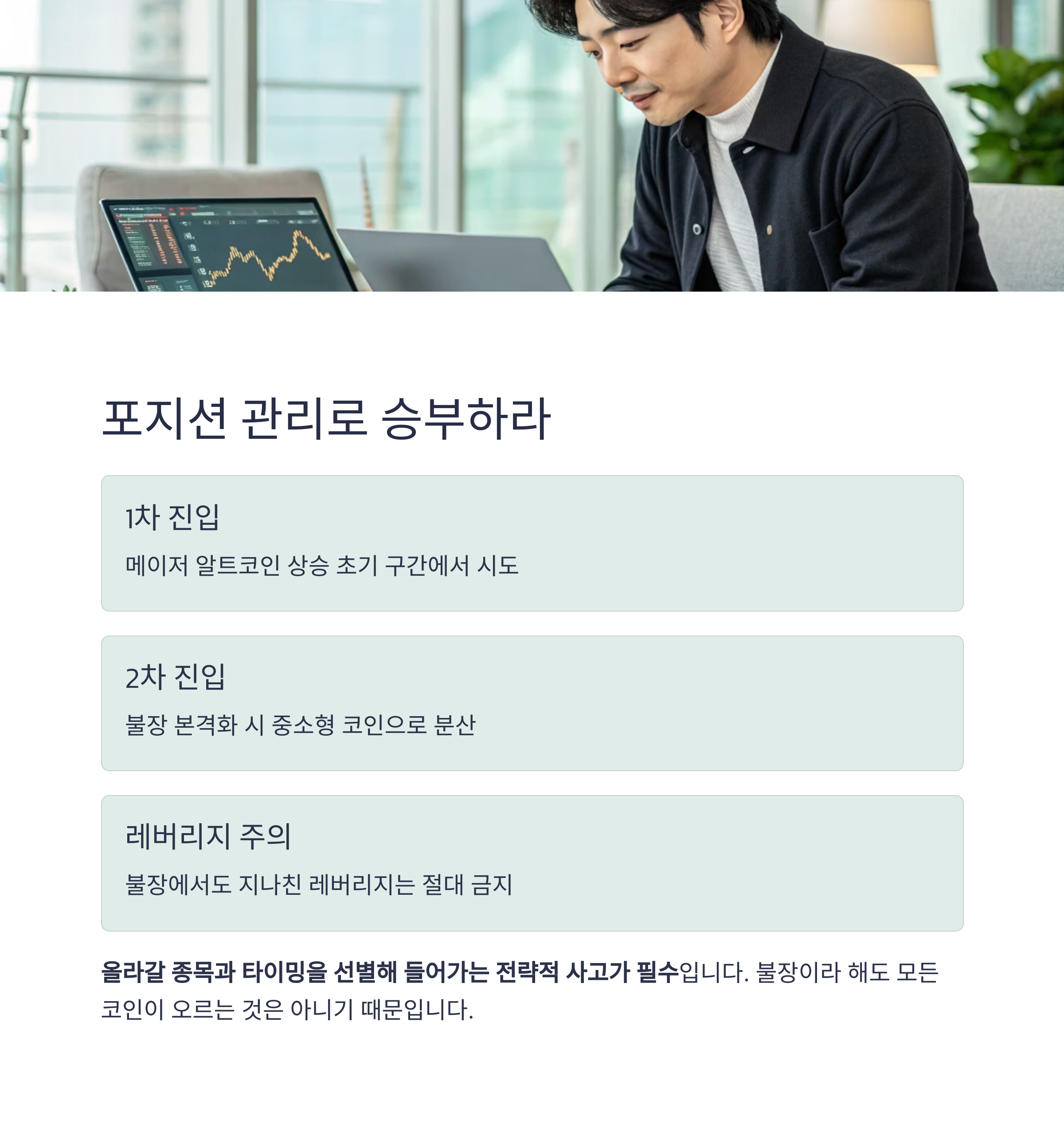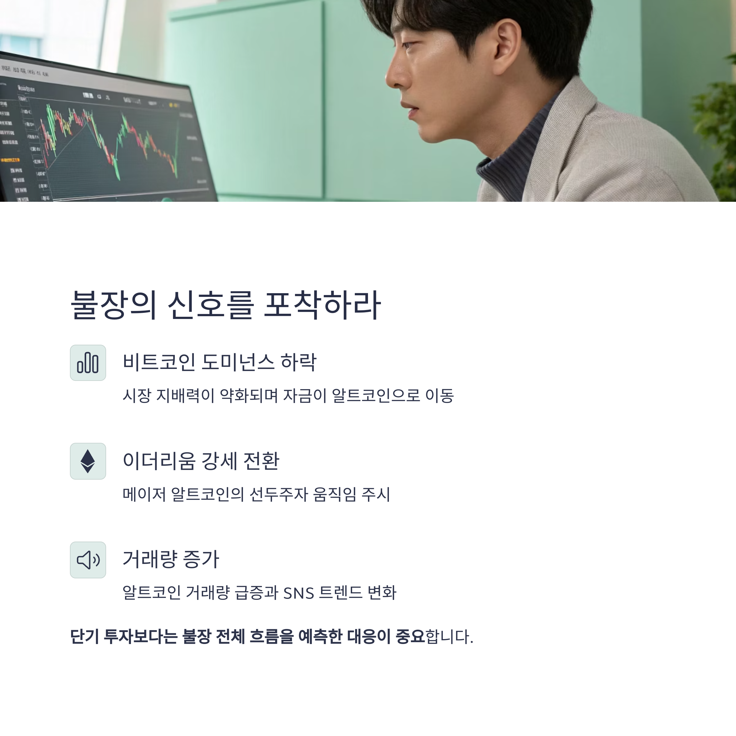 이때는 단기 투자보다는 불장 전체 흐름을 예측한 대응이 중요합니다.