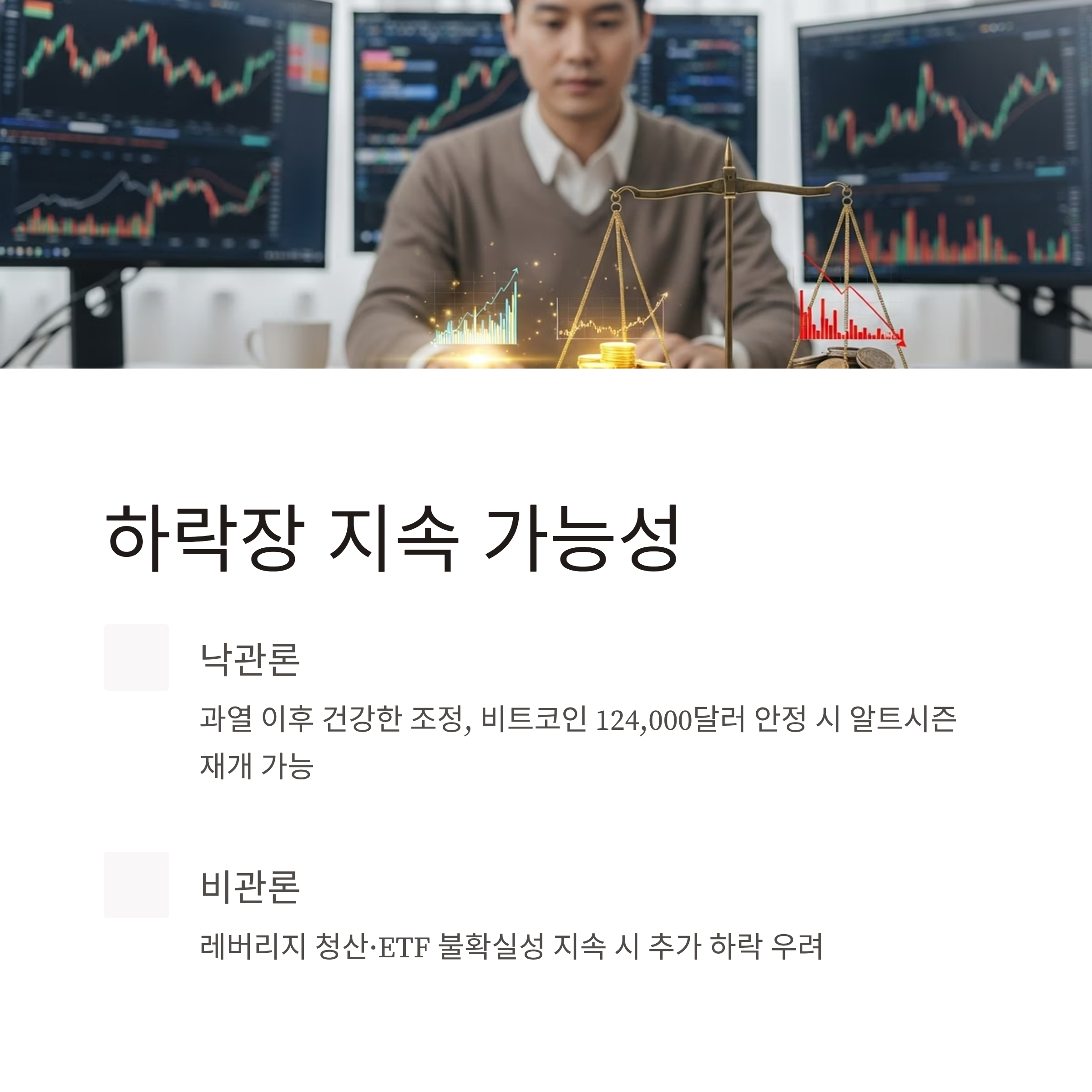 | 비관론 | 레버리지 청산·ETF 불확실성 지속 시 추가 하락 우려 |