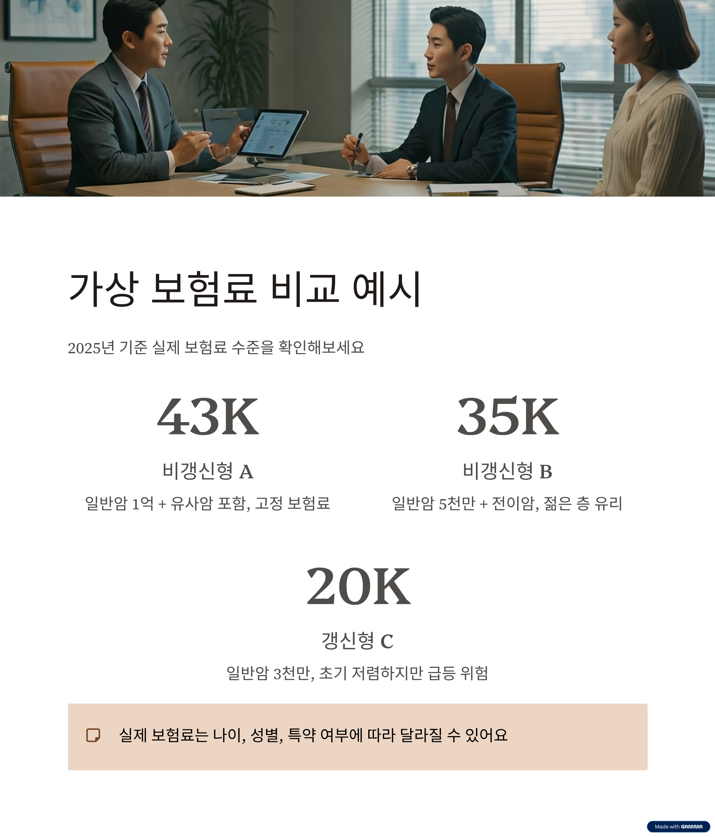 | 갱신형 C | 일반암 3천만 원 보장 | 20,000 ~ 25,000원 | 초기 보험료 낮음. 갱신 시 보험료 급등 가능성 있음 |