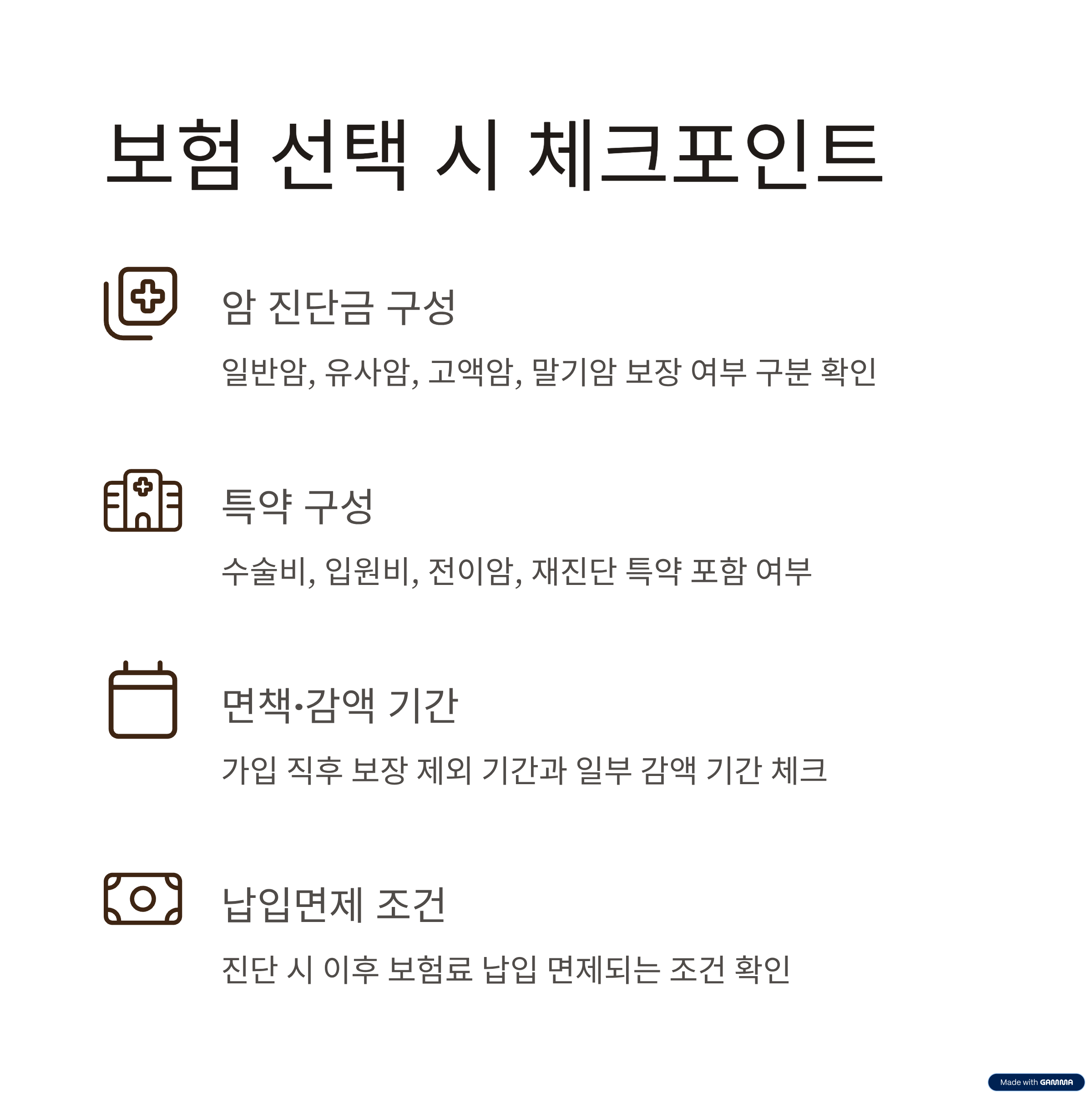| 암 진단금 구성 | 일반암 / 유사암 / 고액암 / 말기암 보장 여부 구분 |
