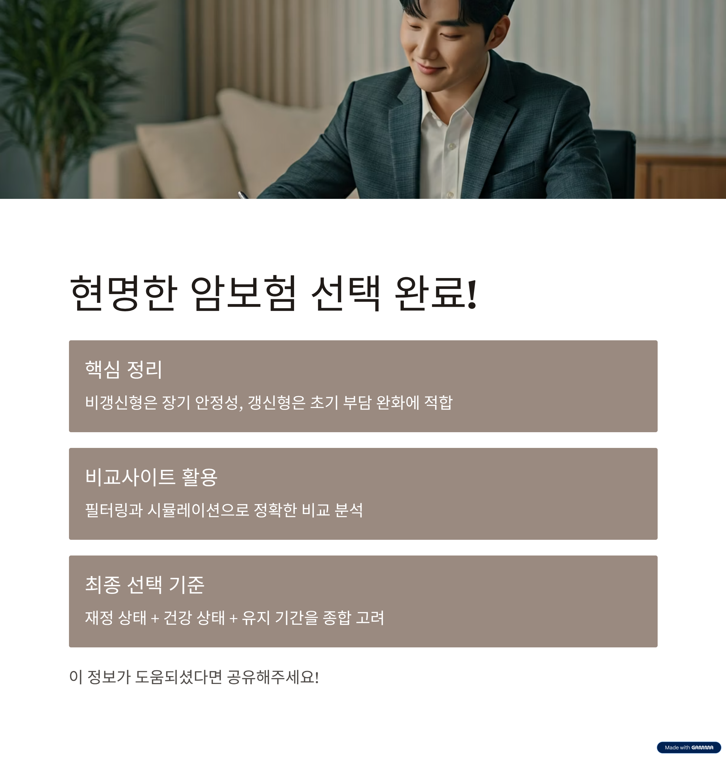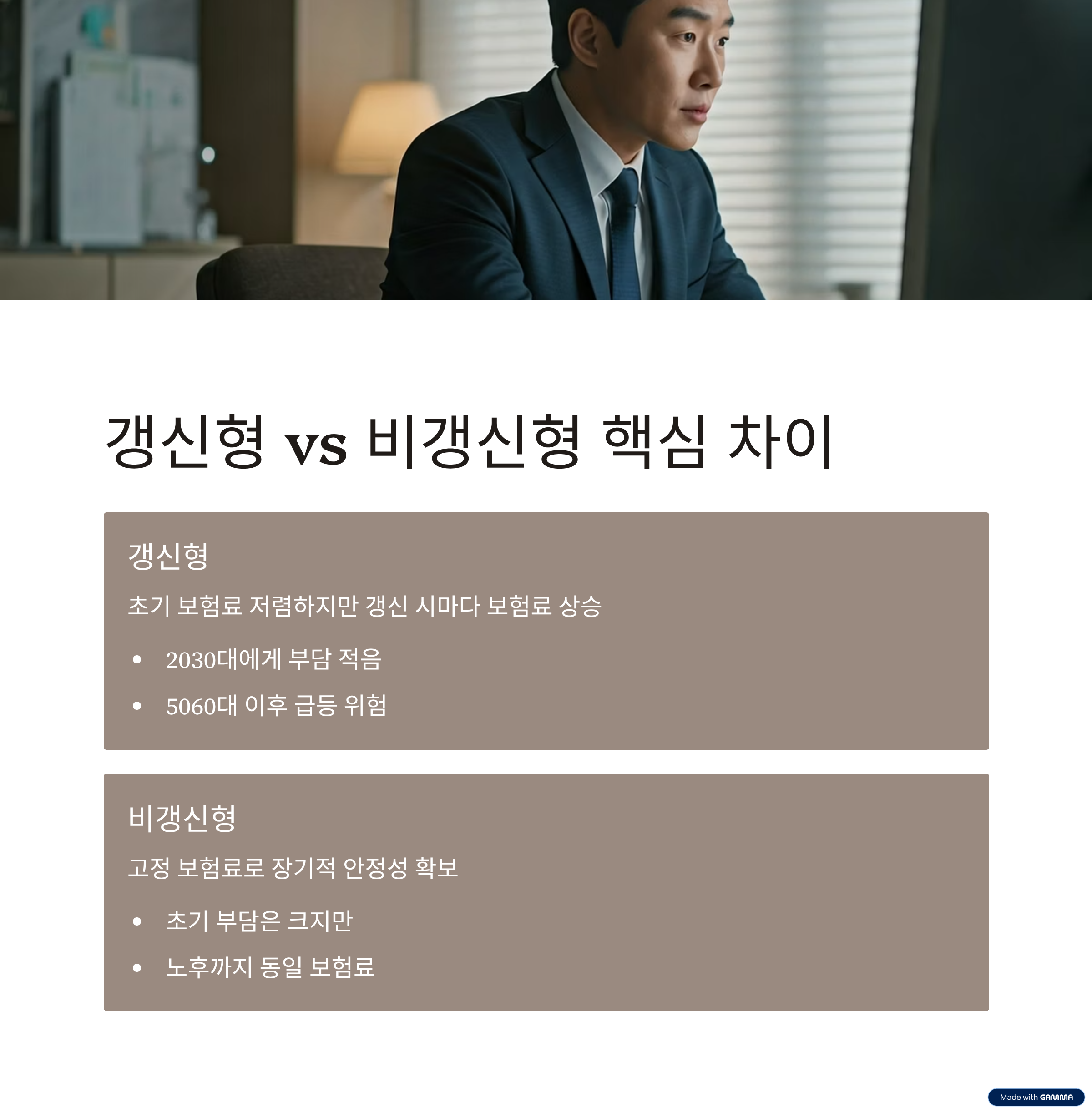 | 보험 유형 선택 | 비갱신형은 고정 보험료로 장기 안정성. 갱신형은 초기 부담 줄이기에 적합 |