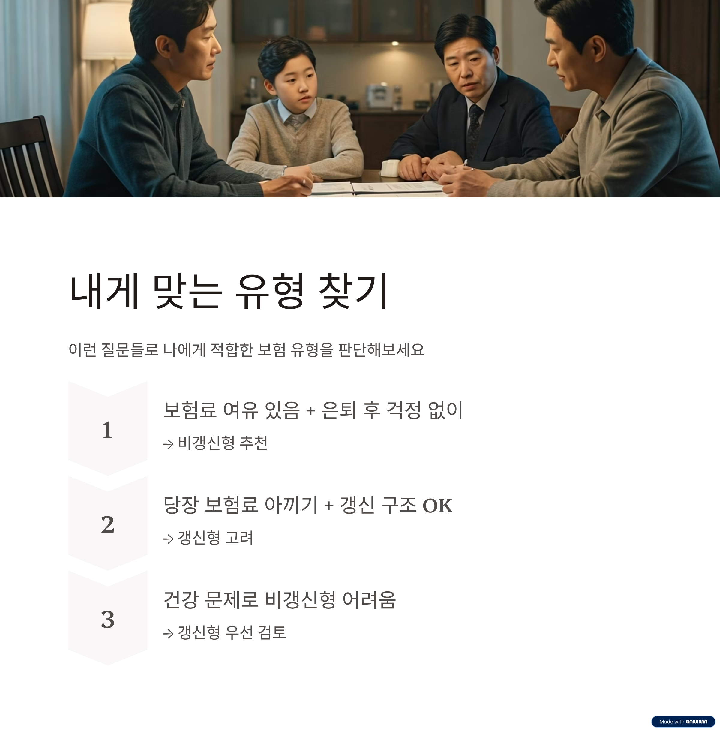 고령자나 과거 병력 있는 경우에는 갱신형으로 시작해야 할 수도 있습니다.