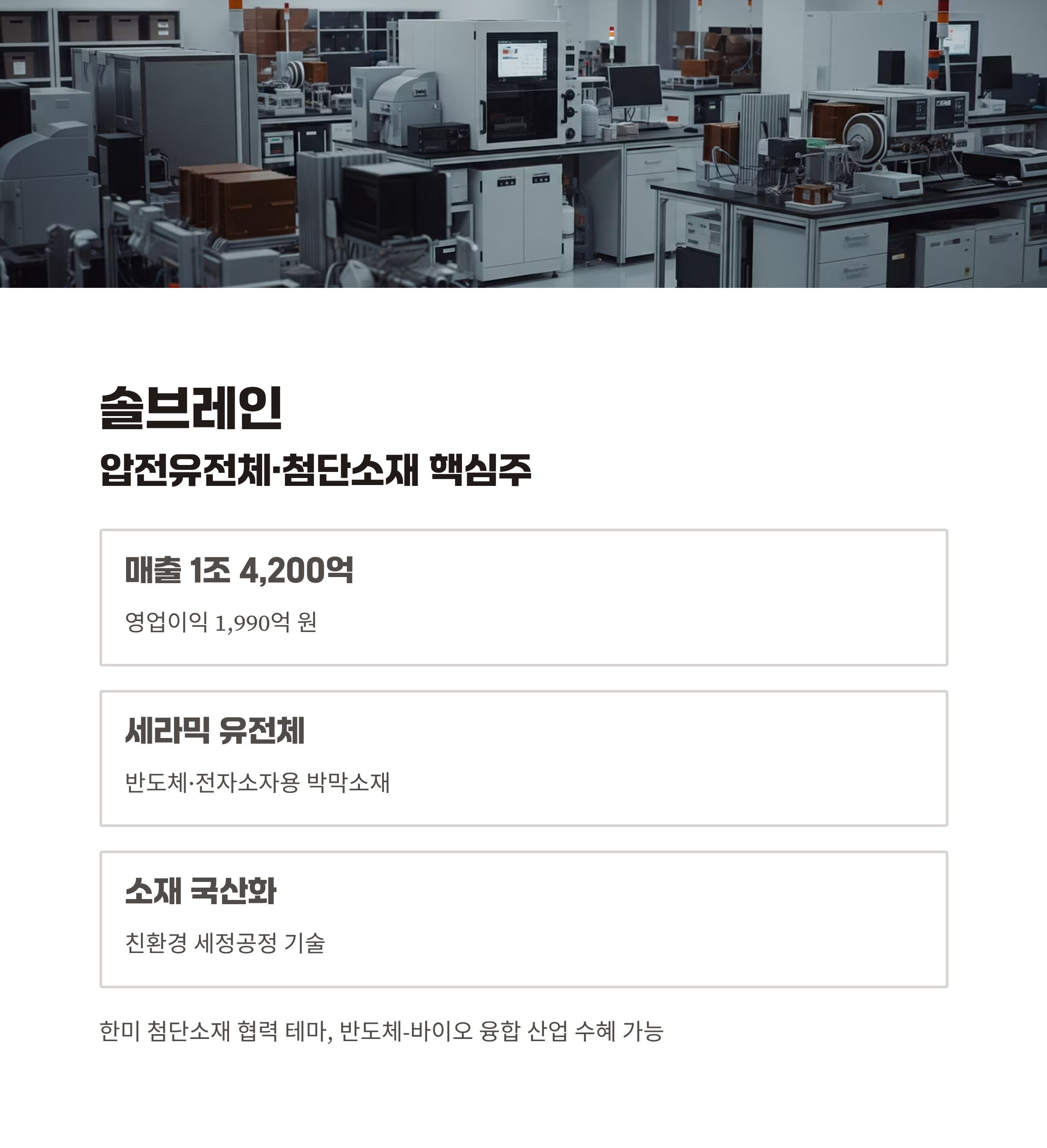 | 솔브레인 | 압전유전체 | +6% | 높음 | ₩300,000 내외(시장추정) | 첨단소재·반도체 수혜 |