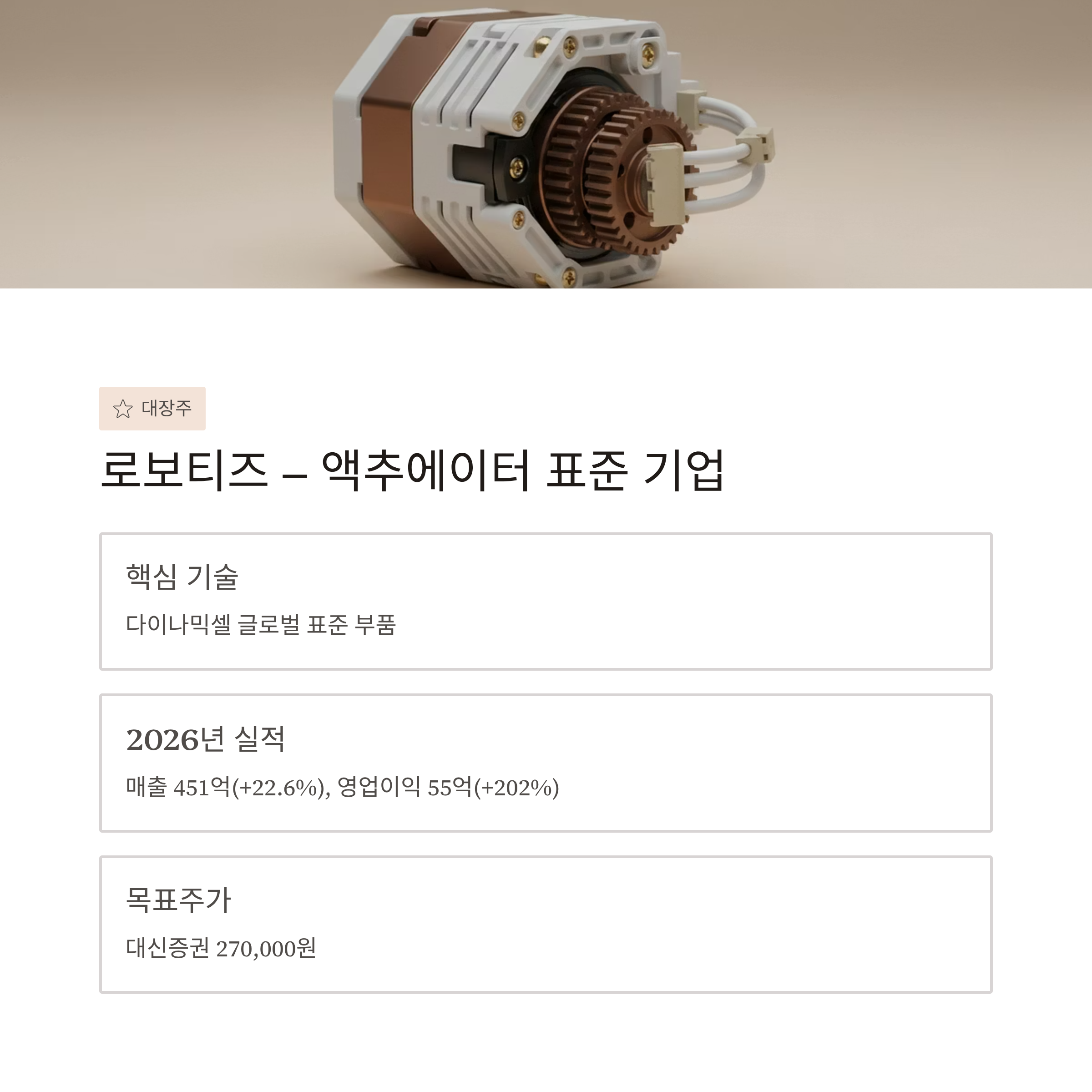 | 로보티즈 (108490) | 통합형 액추에이터 (다이나믹셀) | 글로벌 로봇 표준 부품 / 흑자전환 | 270,000원 (2025.11) |