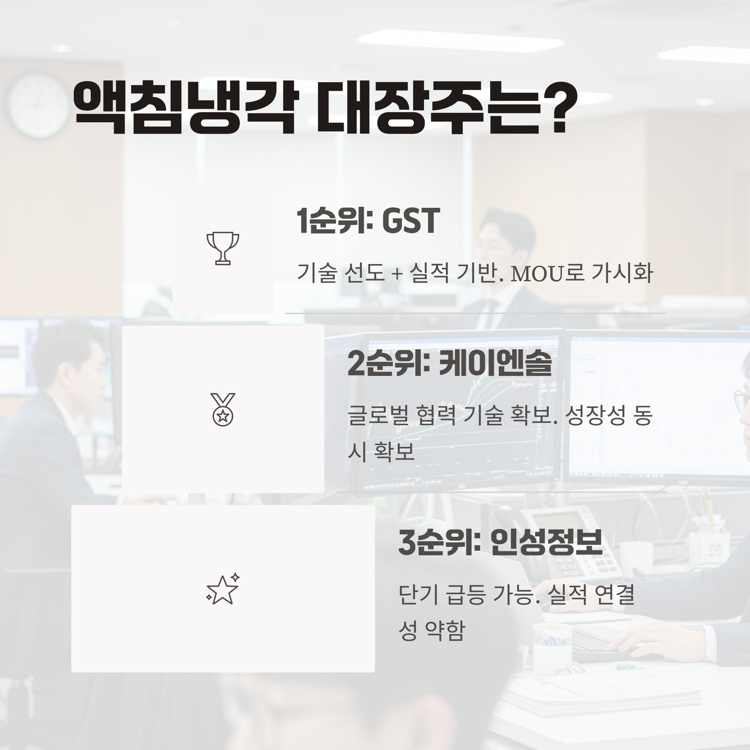 | GST | 액침냉각 솔루션 공동개발 | PER 5.4 / PBR 1.26 | 약 2.6~2.8만원 / +30% 이상 | 기술 선도 + 실적 겸비 가능성 있음 |