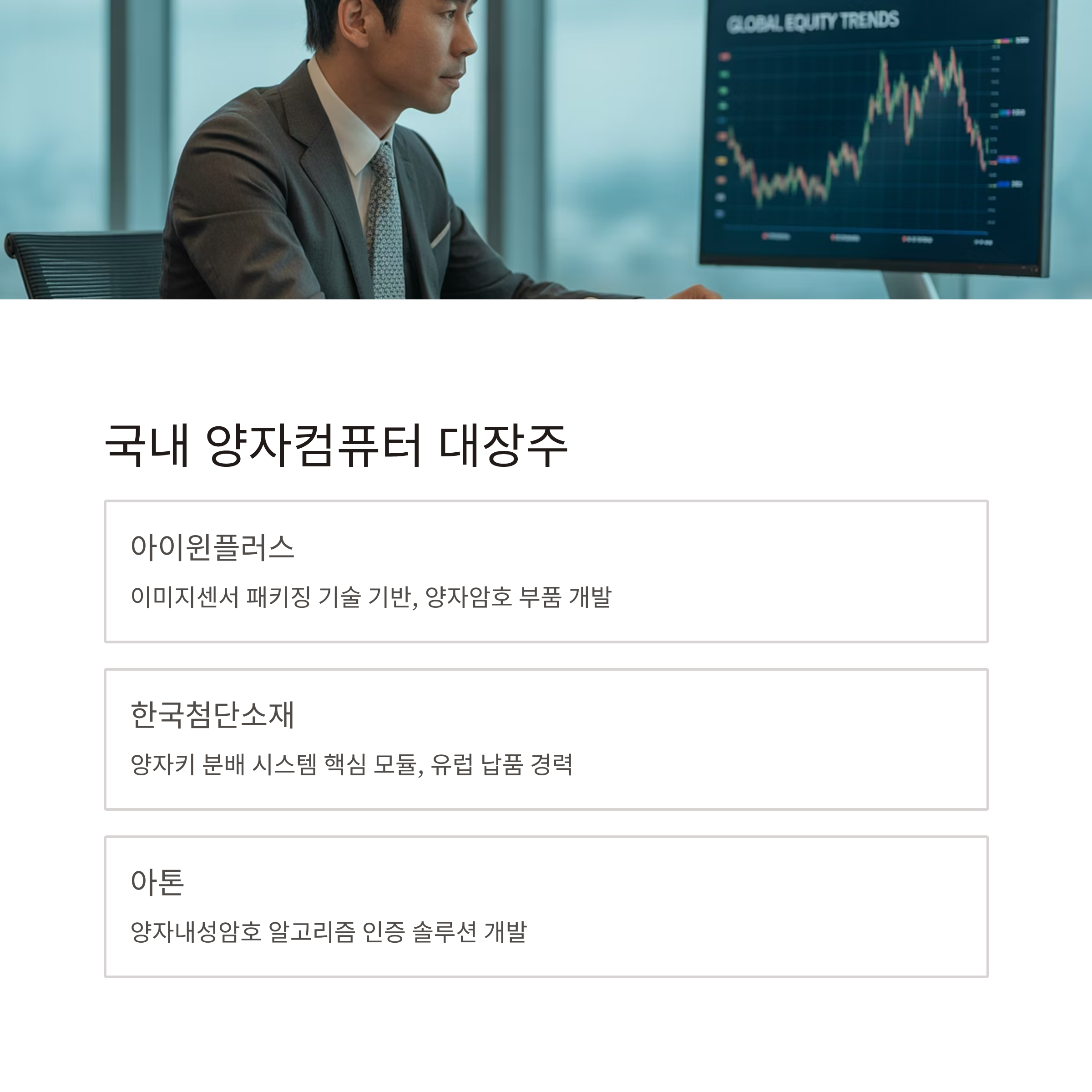 - 대장주: 국내(아이윈플러스, 한국첨단소재, 아톤), 해외(IonQ, D-Wave)