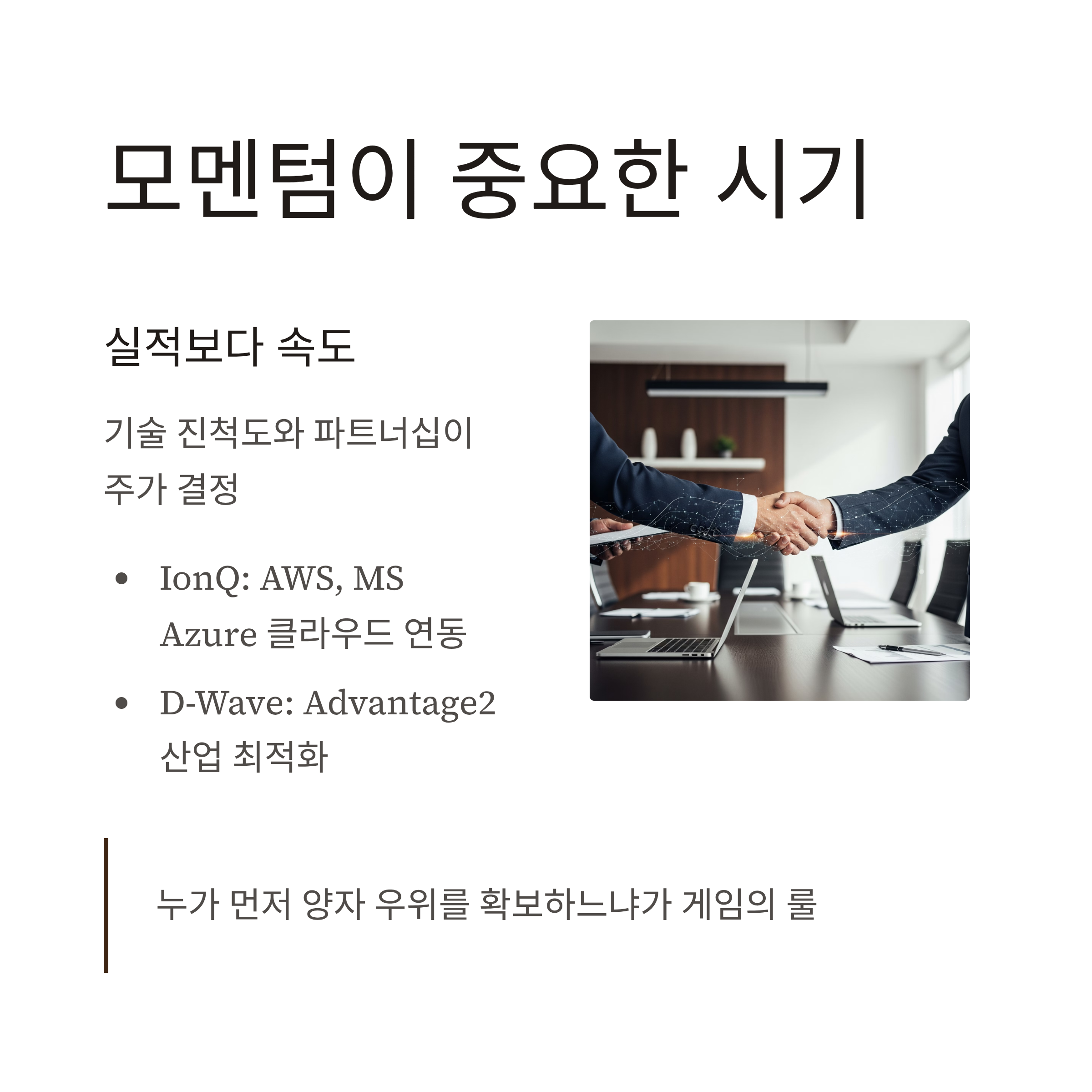 현재 대부분 양자컴퓨팅 관련주는 수익 모델이 뚜렷하지 않으며, 실적보다는 기술적 진척도와 파트너십 확장에 주가가 반응하고 있습니다.