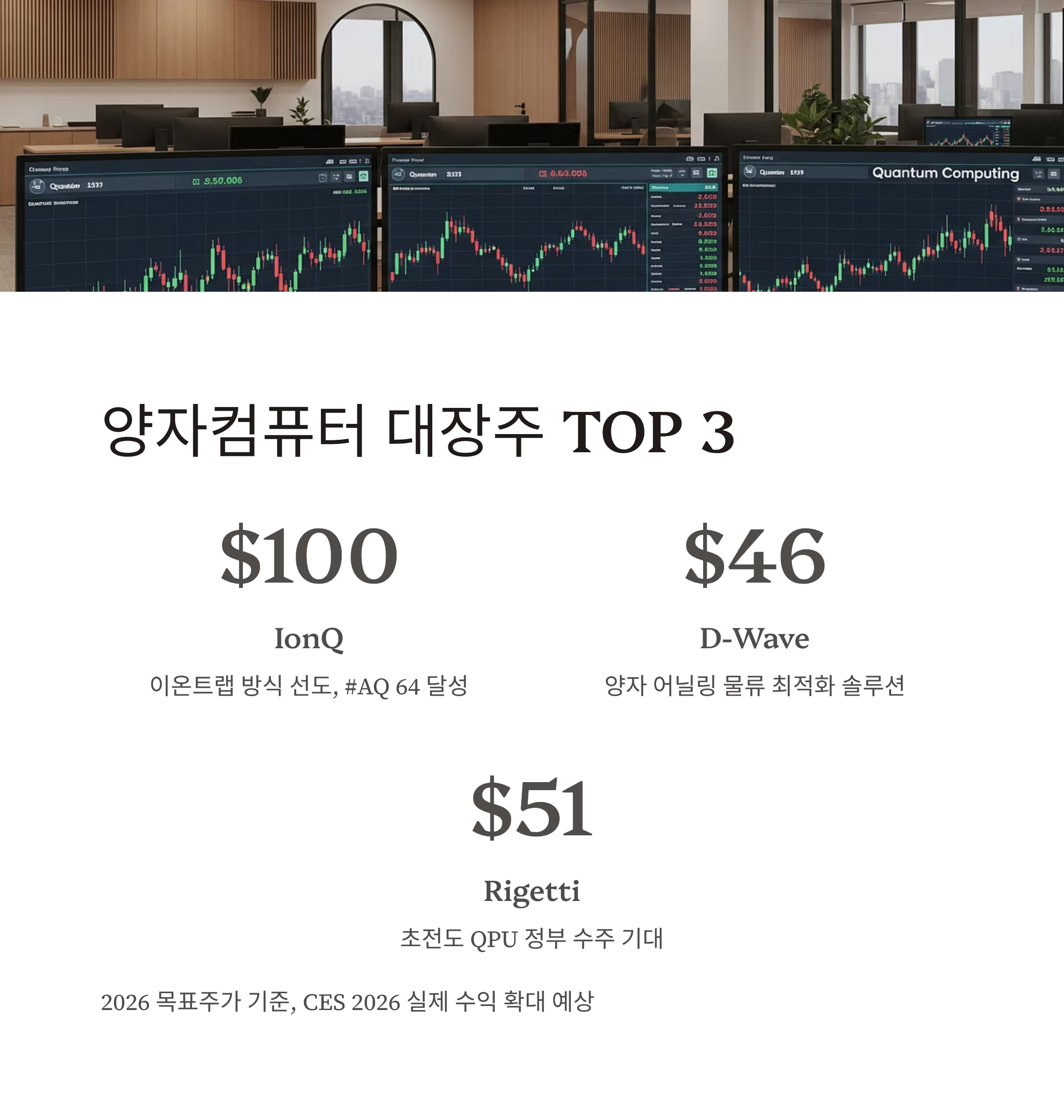 아이온큐는 2025년 말 #AQ 64를 달성하며 기술적 이정표를 세웠고, 미국 Jefferies는 $100까지 목표주가를 상향 조정한 상태입니다. 디웨이브는 산업 적용에 집중하고 있으며, CES 2026을 기점으로 실제 수익 확대가 기대됩니다. 리게티는 여전히 높은 변동성을 보이지만, 기술적 완성도를 기반으로 잠재력이 높게 평가되고 있습니다.