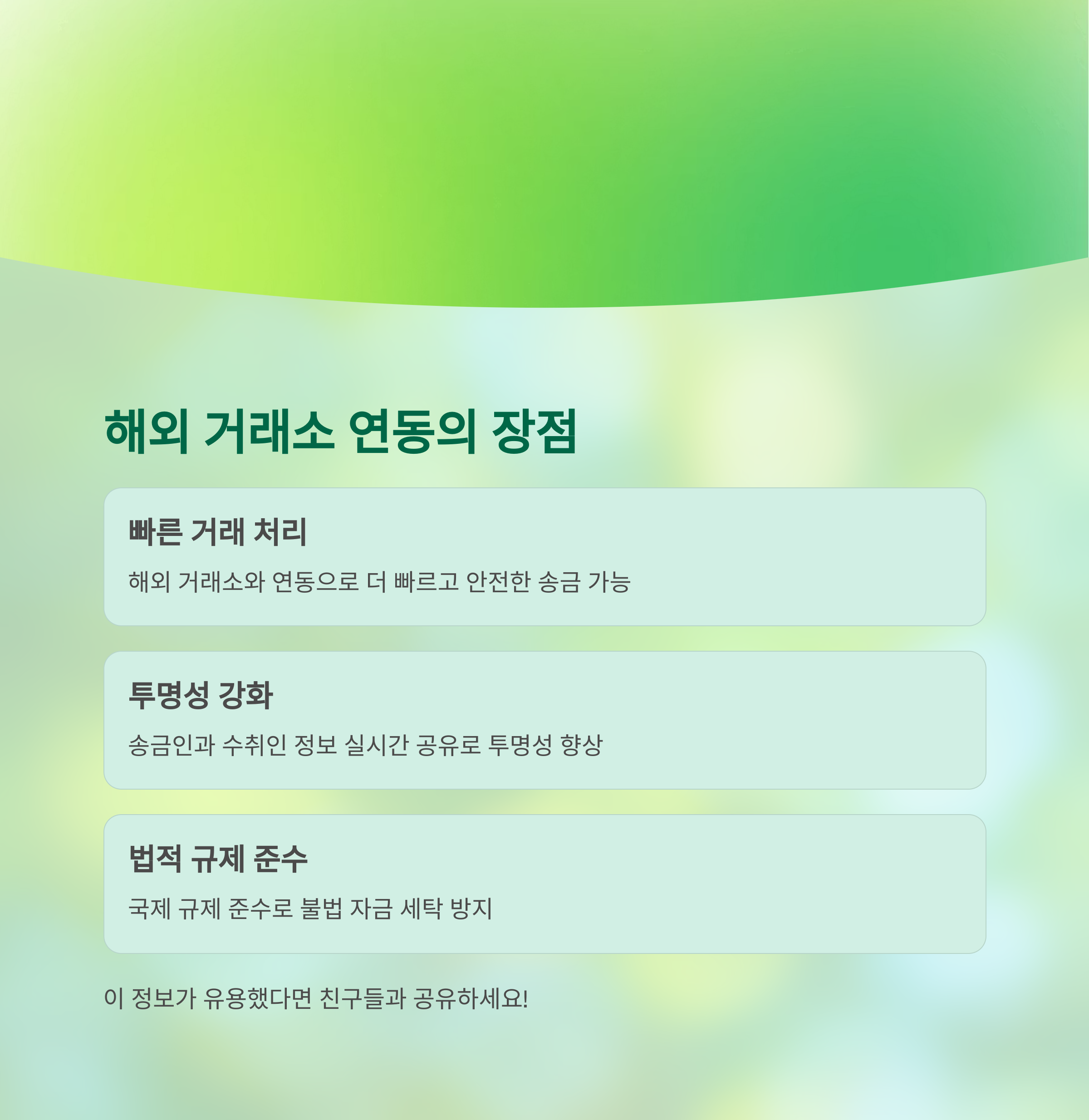 - 빠른 거래 처리: 해외 거래소와의 연동을 통해 더욱 빠르고 안전한 송금이 가능해졌습니다.
