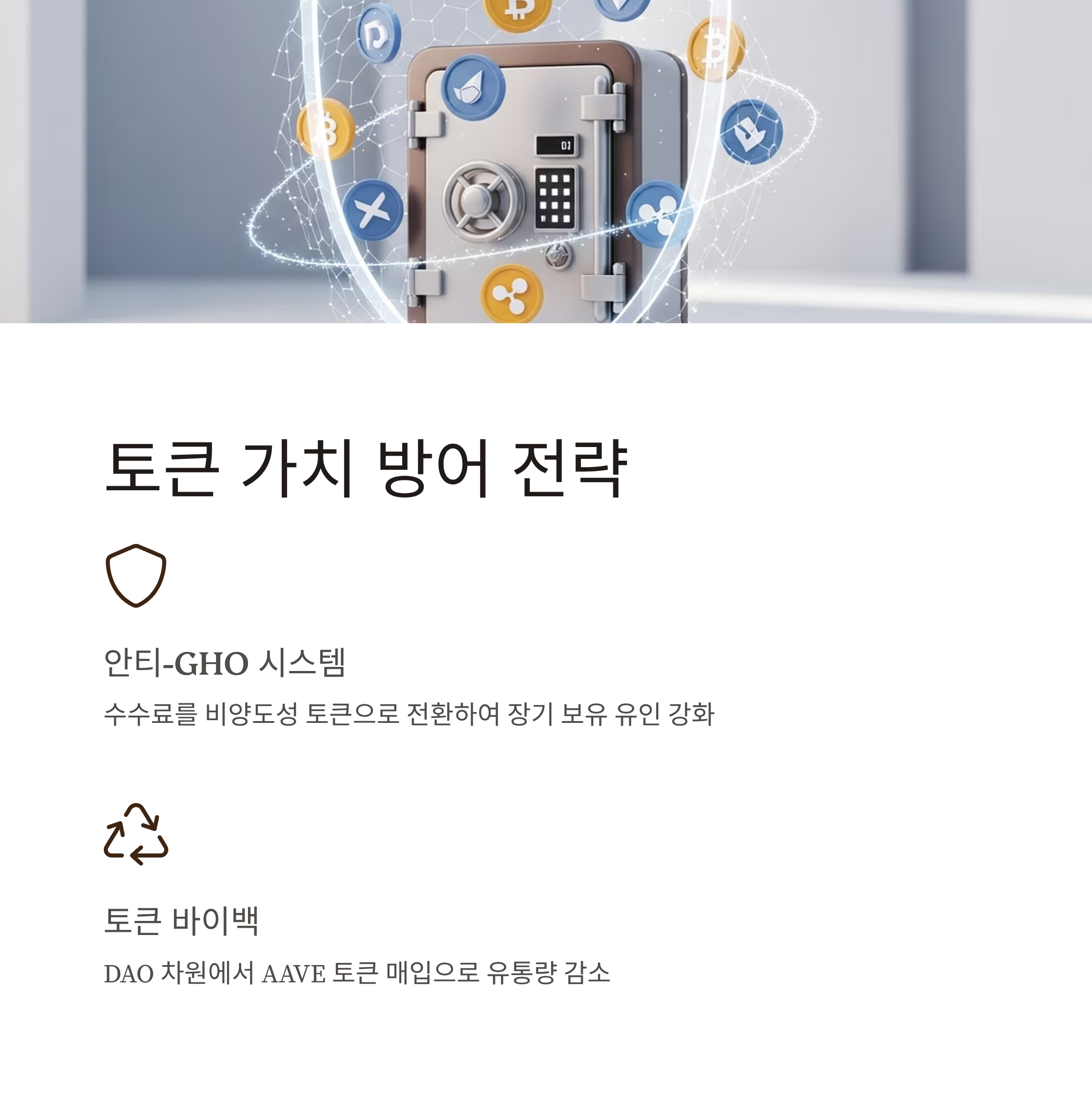 또한 DAO 차원에서 AAVE 토큰을 바이백해 유통량을 줄이고, 공급 억제를 통해 시장 가격을 지지하고 있습니다. 이 모든 전략은 토큰 가치의 하방을 방어하는 데 기여하고 있습니다.