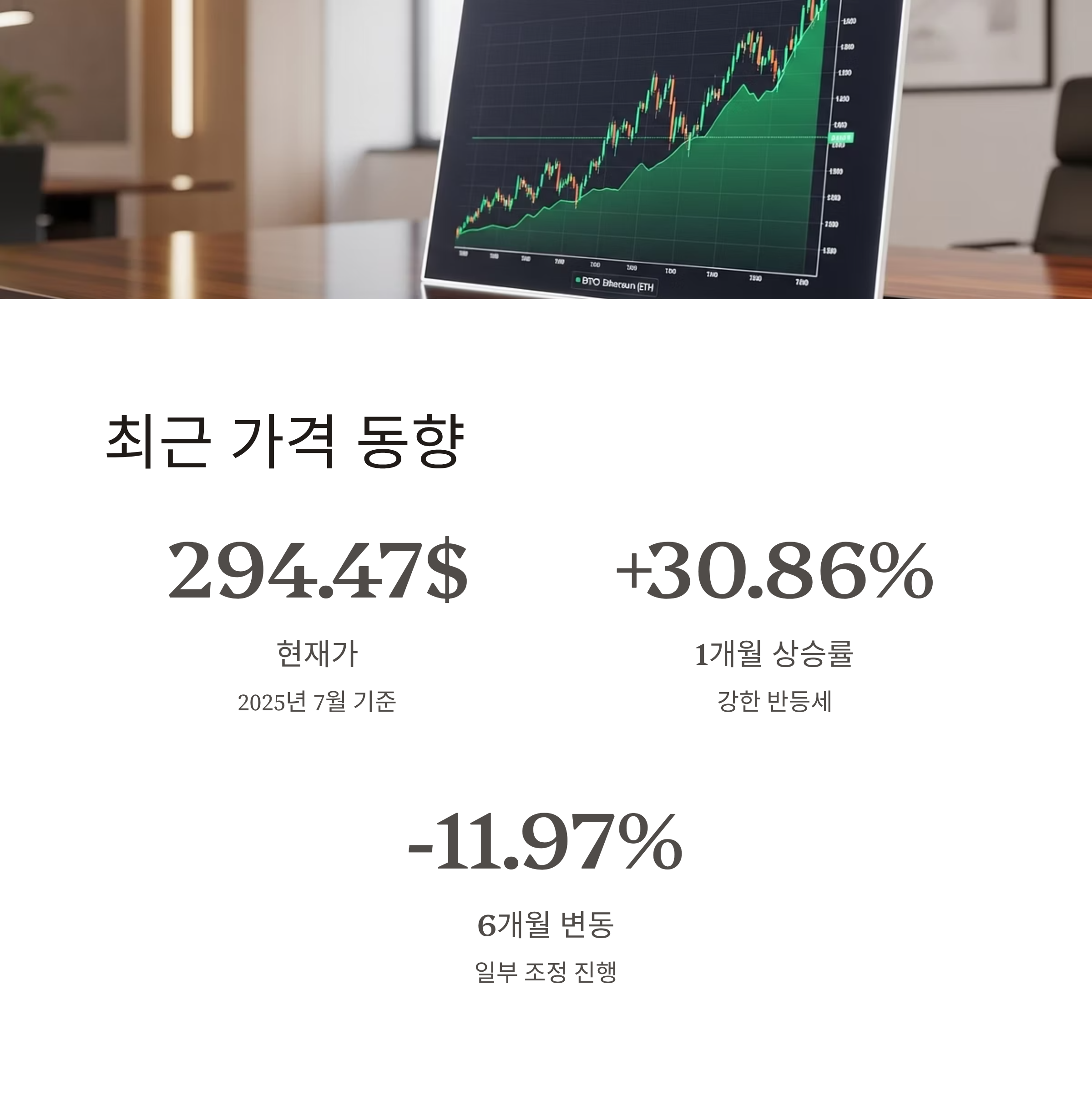 2025년 7월 25일 기준 AAVE는 294.47달러를 기록하고 있습니다. 1일간 +1.82%의 상승률을 보였고, 최근 1개월간 30.86% 급등하며 강한 반등세를 보였습니다. 반면 6개월 기준으로는 -11.97%로, 전 고점 대비 일부 조정을 받은 상황입니다.