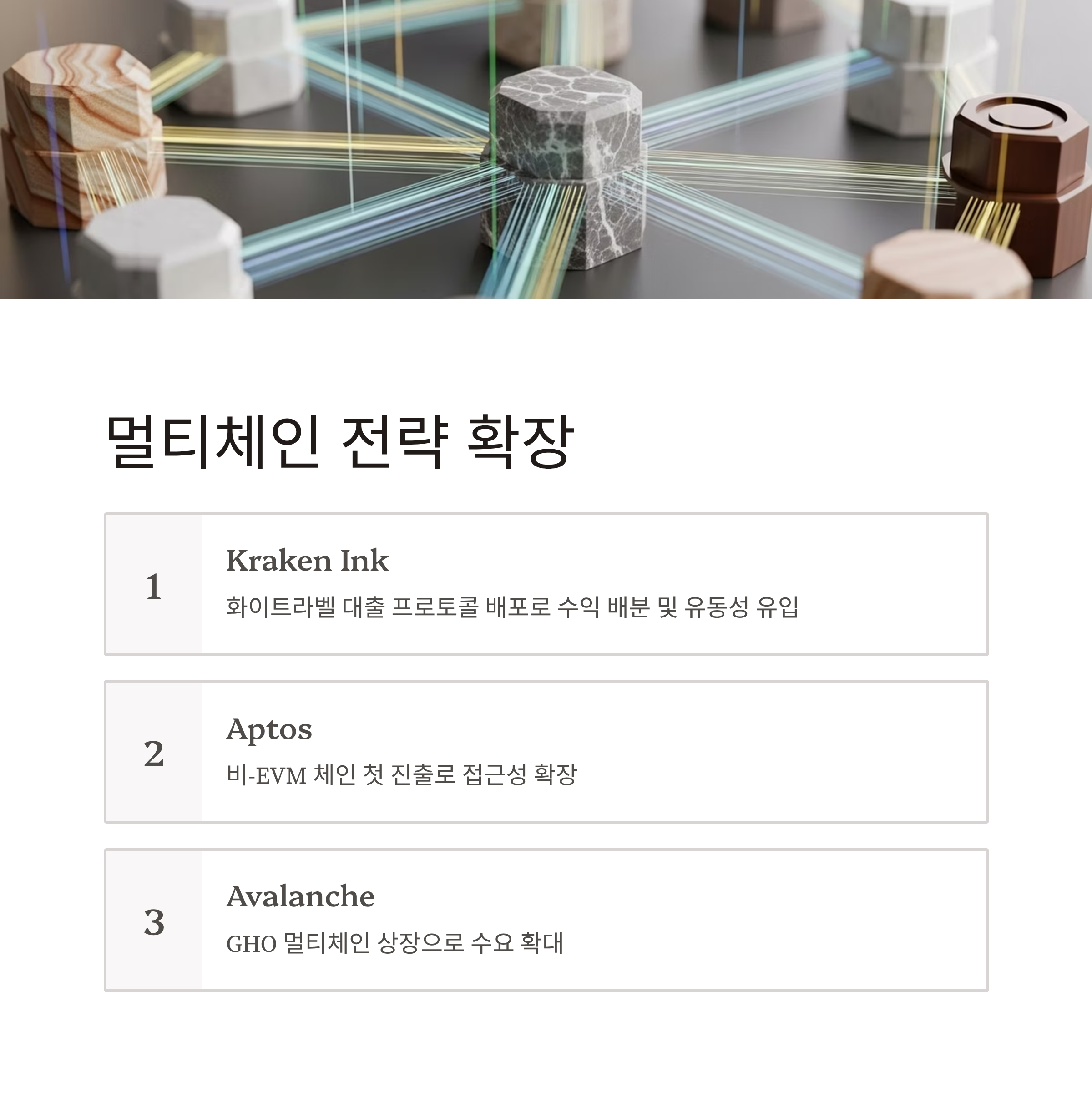 AAVE는 중앙집중형 거래소 크라켄의 블록체인인 Ink에 화이트라벨 대출 프로토콜을 배포하고, Aptos와 협력하여 비-EVM 기반 DeFi로 확장을 꾀하고 있습니다.