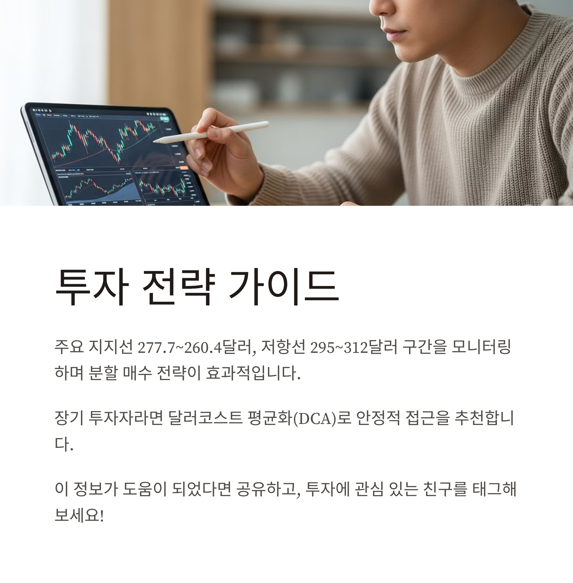 중기적으로는 R1(약 295달러), R2(303달러), R3(312달러) 수준에서 저항을 받을 수 있습니다. 따라서 손절 기준을 정하고 분할 매수 전략으로 접근하는 것이 효과적입니다.