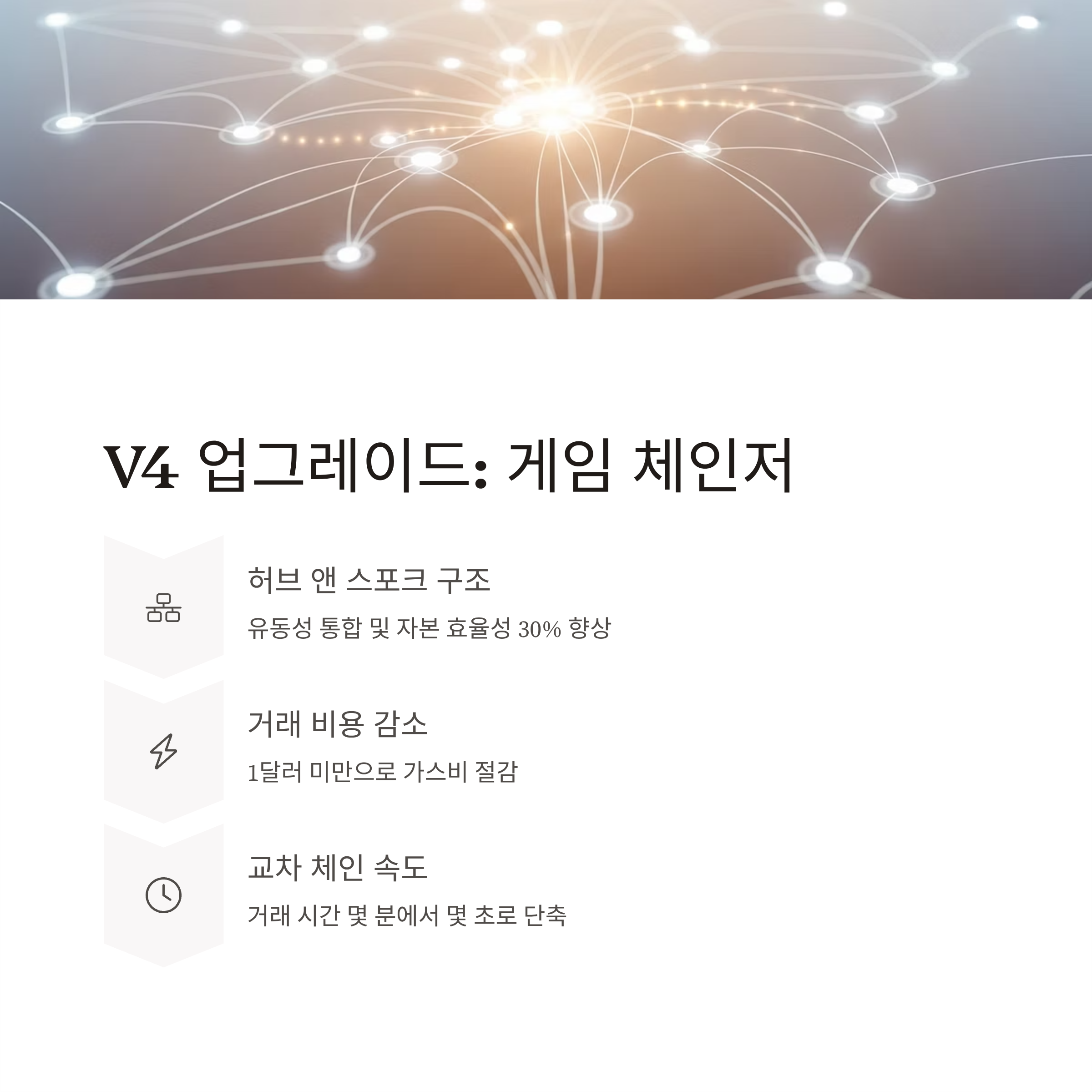 에이브의 가장 강력한 호재는 바로 Aave V4 업그레이드입니다. 2025년 3분기 메인넷을 목표로 진행 중인 V4는 ‘허브 앤 스포크’ 구조를 도입해 유동성 통합, 낮은 가스비, 자동화 기능을 강화할 예정입니다.