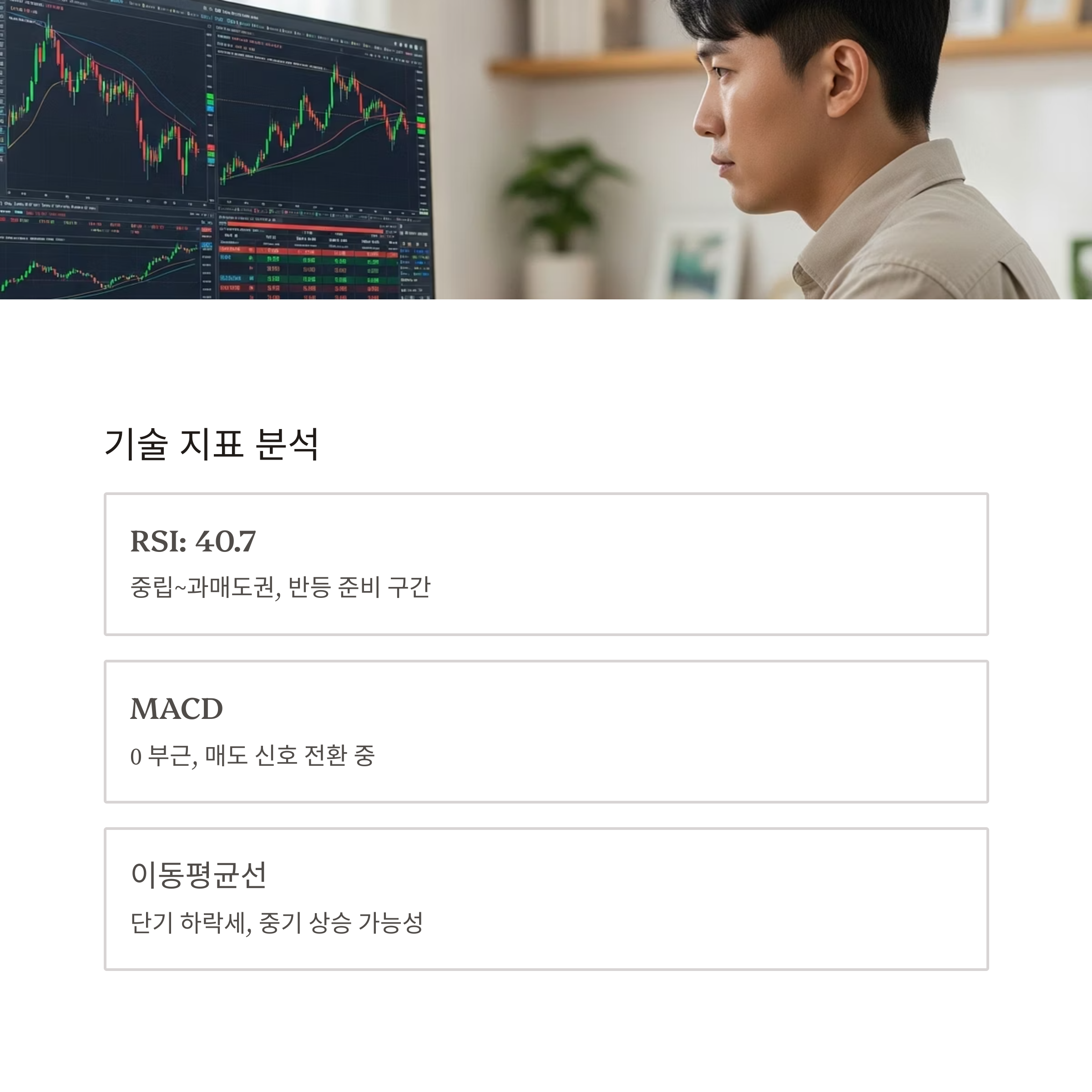 | RSI(14) | 약 40.7 | 중립~과매도권, 반등 준비 구간 |