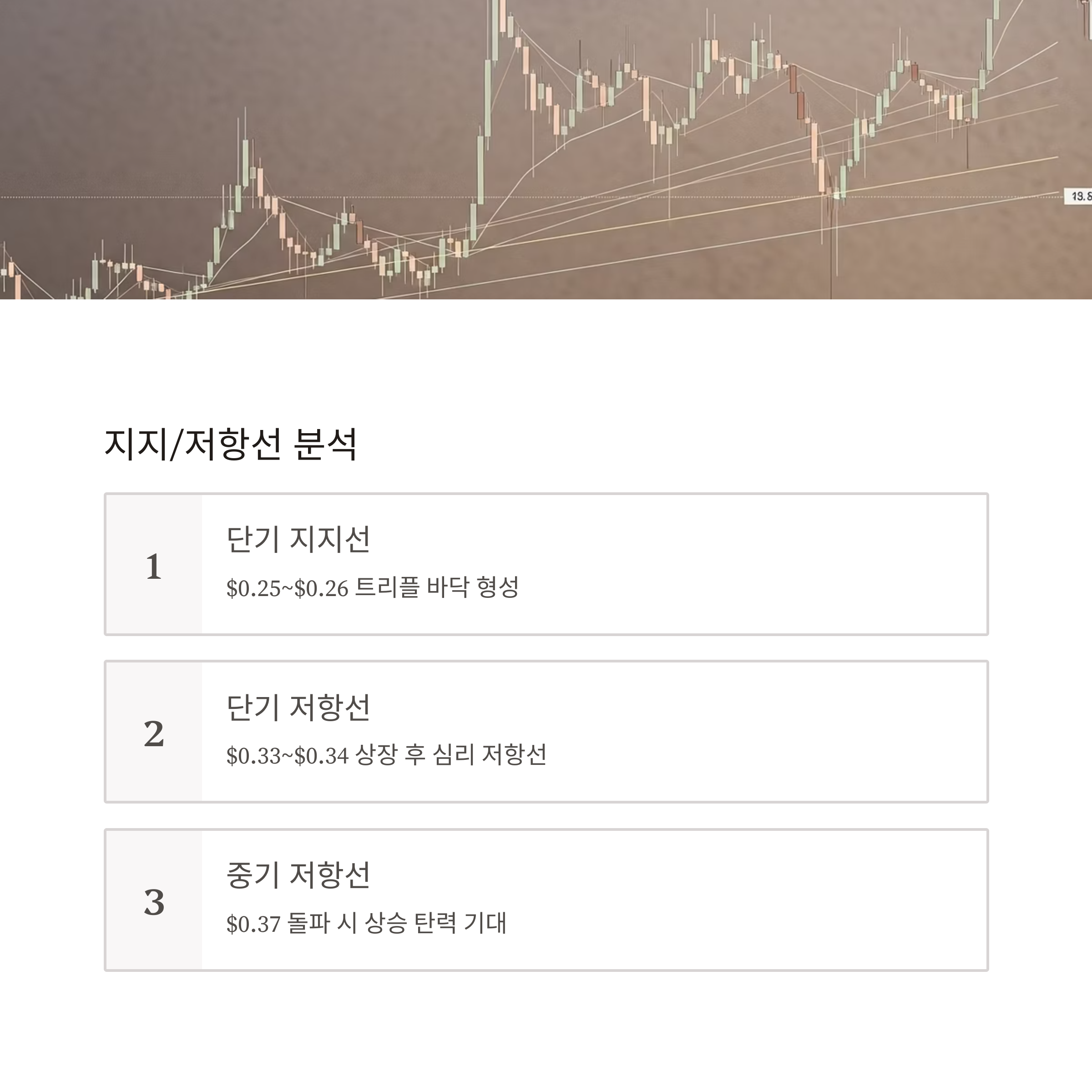 | 중기 저항선 | $0.37 | 피봇 저항 R3, 돌파 시 상승 탄력 기대 가능 |